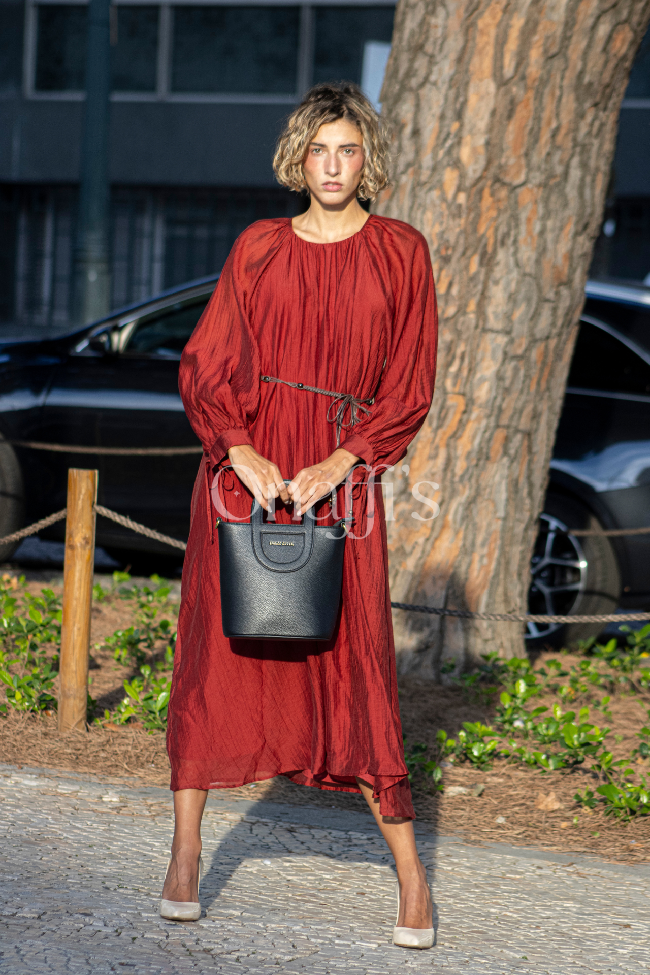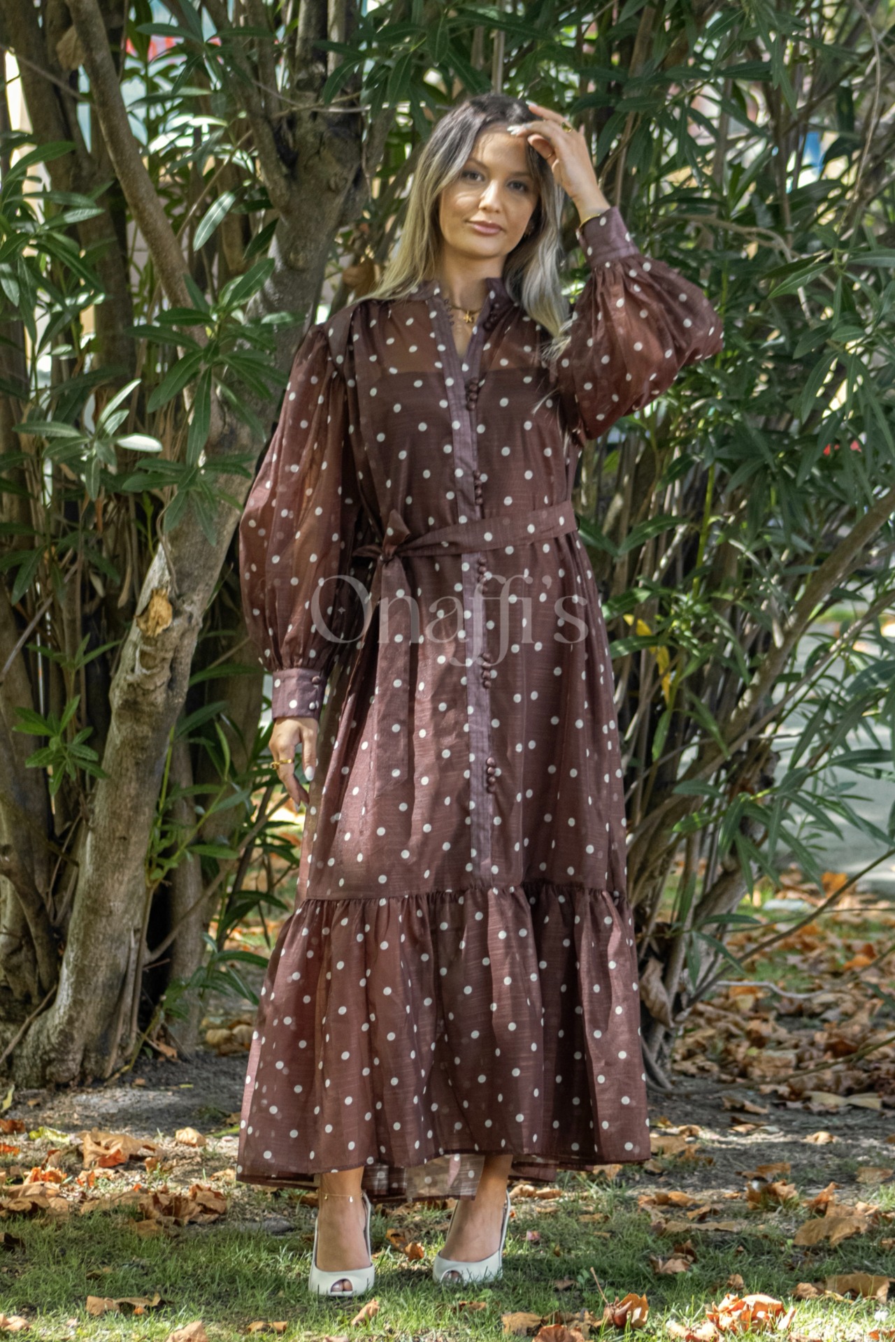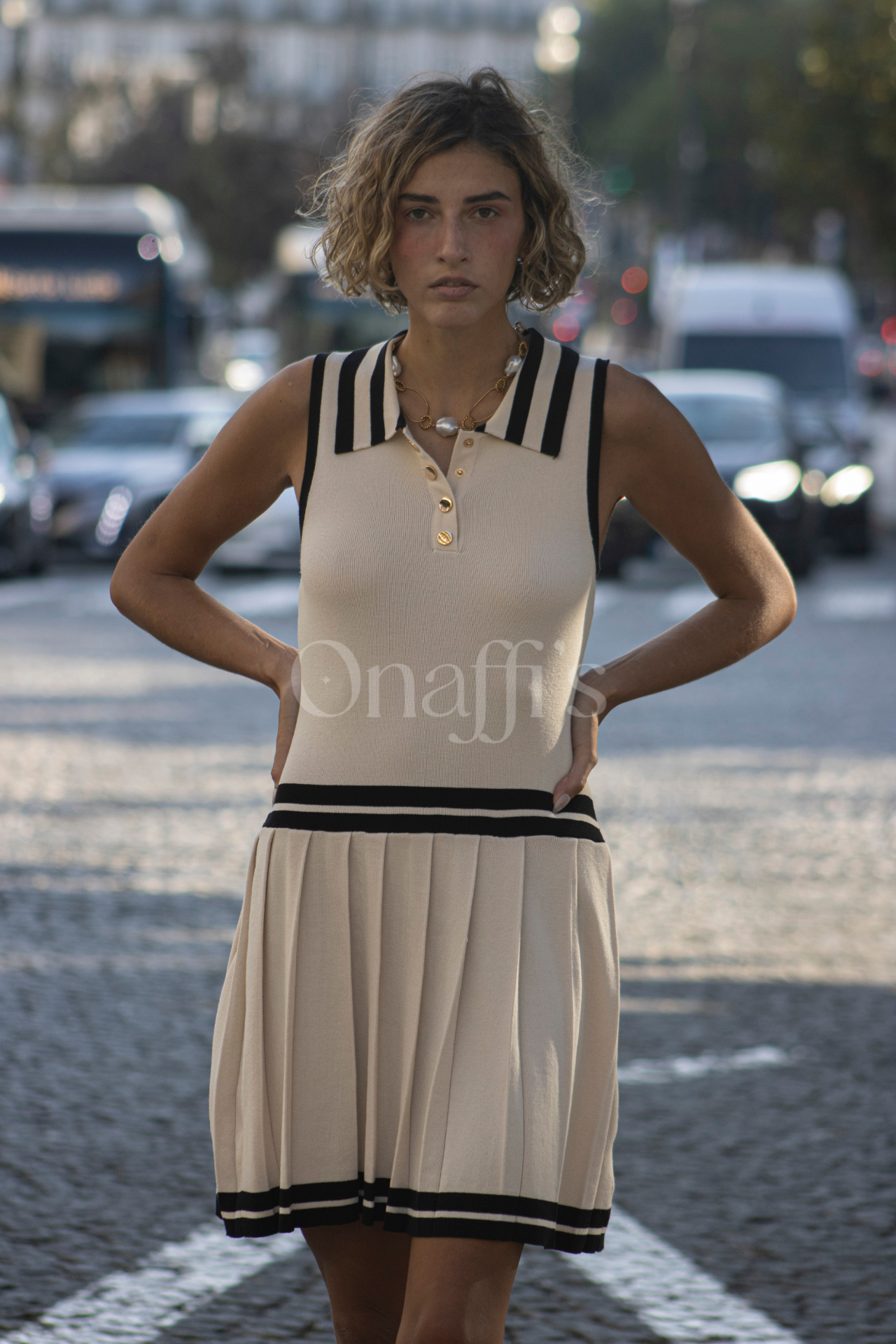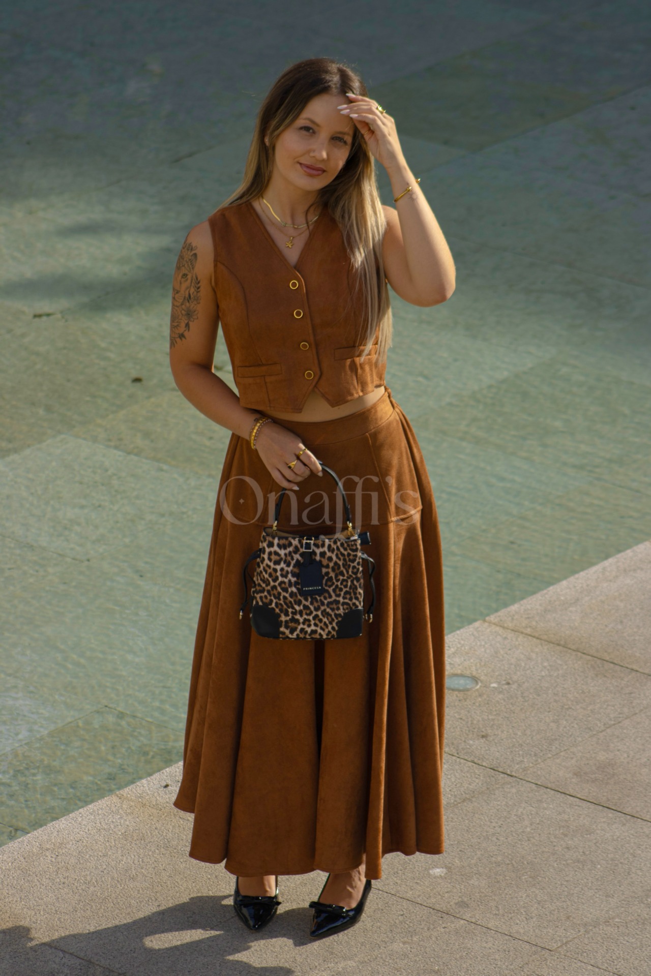 Vestido preto longo com dois apontamentos dourados, um lateral na cintura e um no ombro do lado oposto. Nos locais dos apontamentos dourados o tecido faz um efeito drapeado suave e na cintura o recorte do vestido favorece a sua silhueta. Estas características proporcionam um look elegante e sofisticado. Vários looks, a mesma elegância ... Onaffi's. Composição: 95% poliéster, 5% elastano