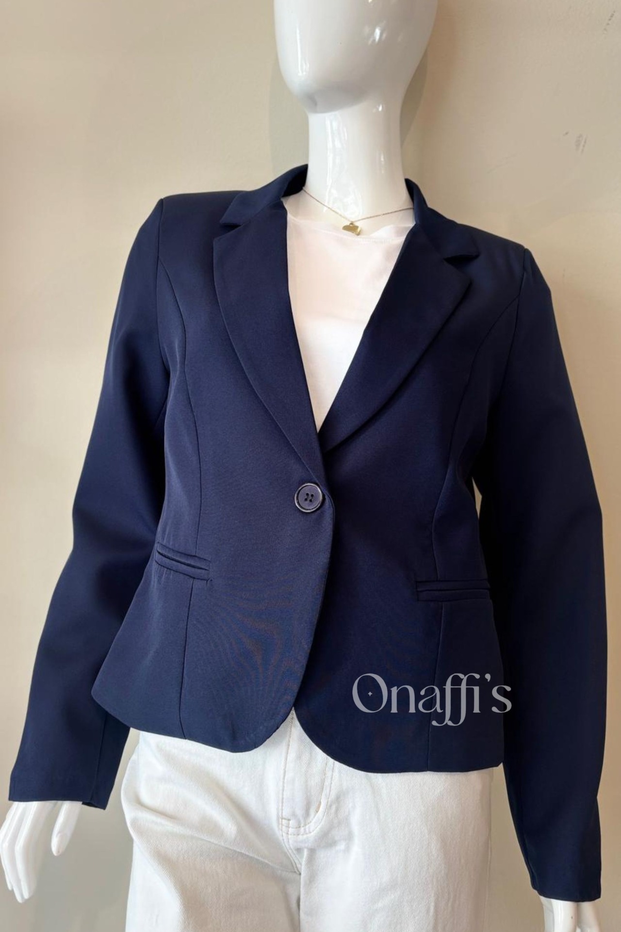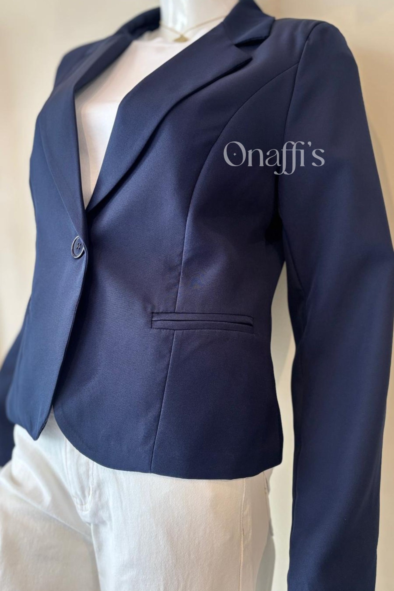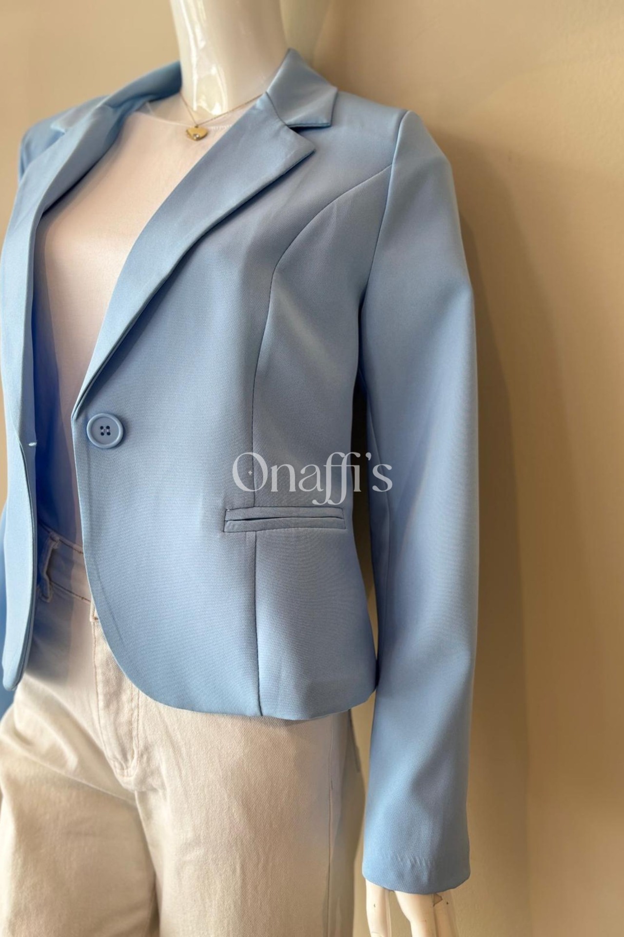 Este blazer curto é a expressão máxima da alfaiataria moderna e versátil. O design arquitetônico, com lapelas polidas e corte ajustado, realça a cintura com elegância.