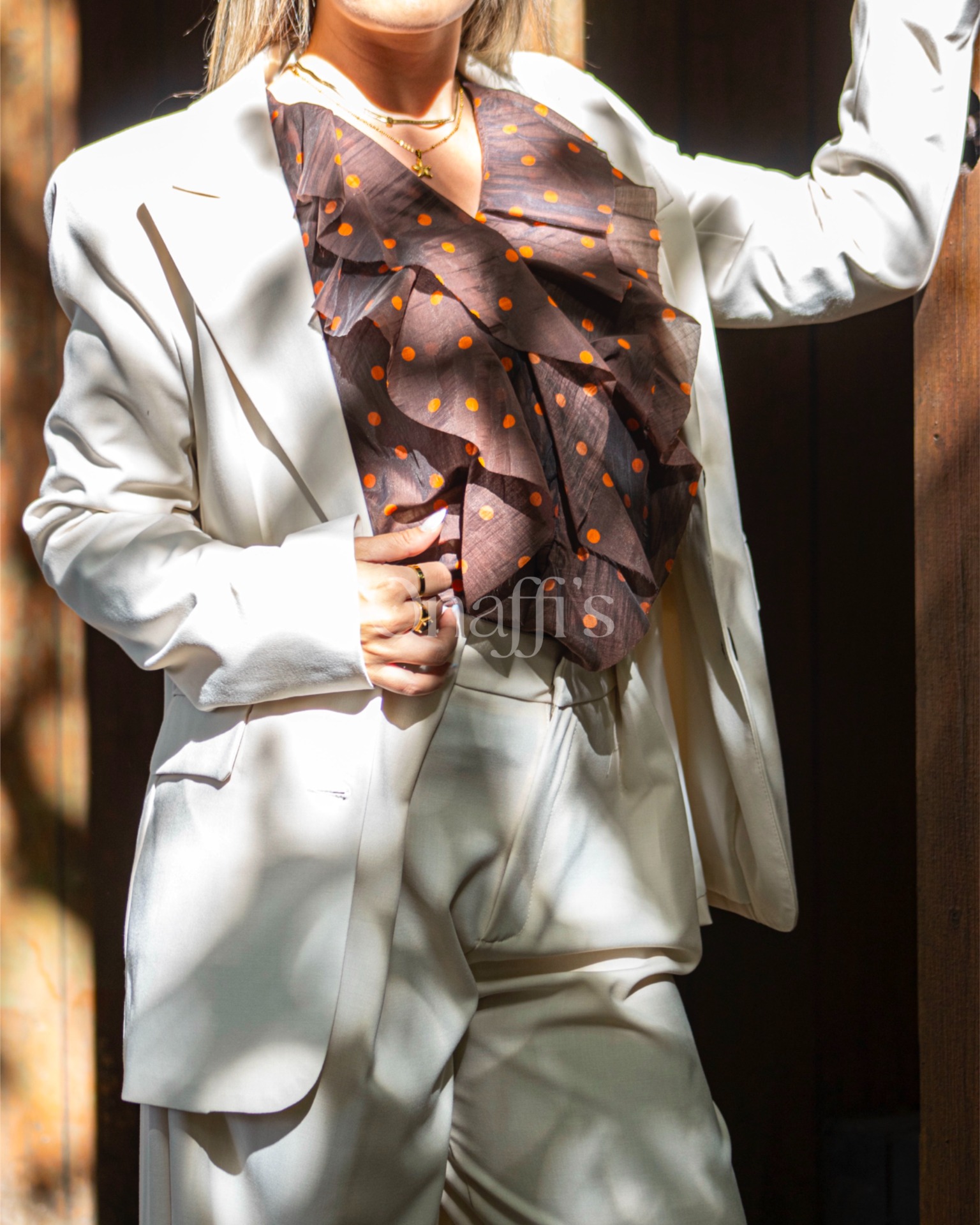 Conjugado com a calça do mesmo tecido e cor cria um look
