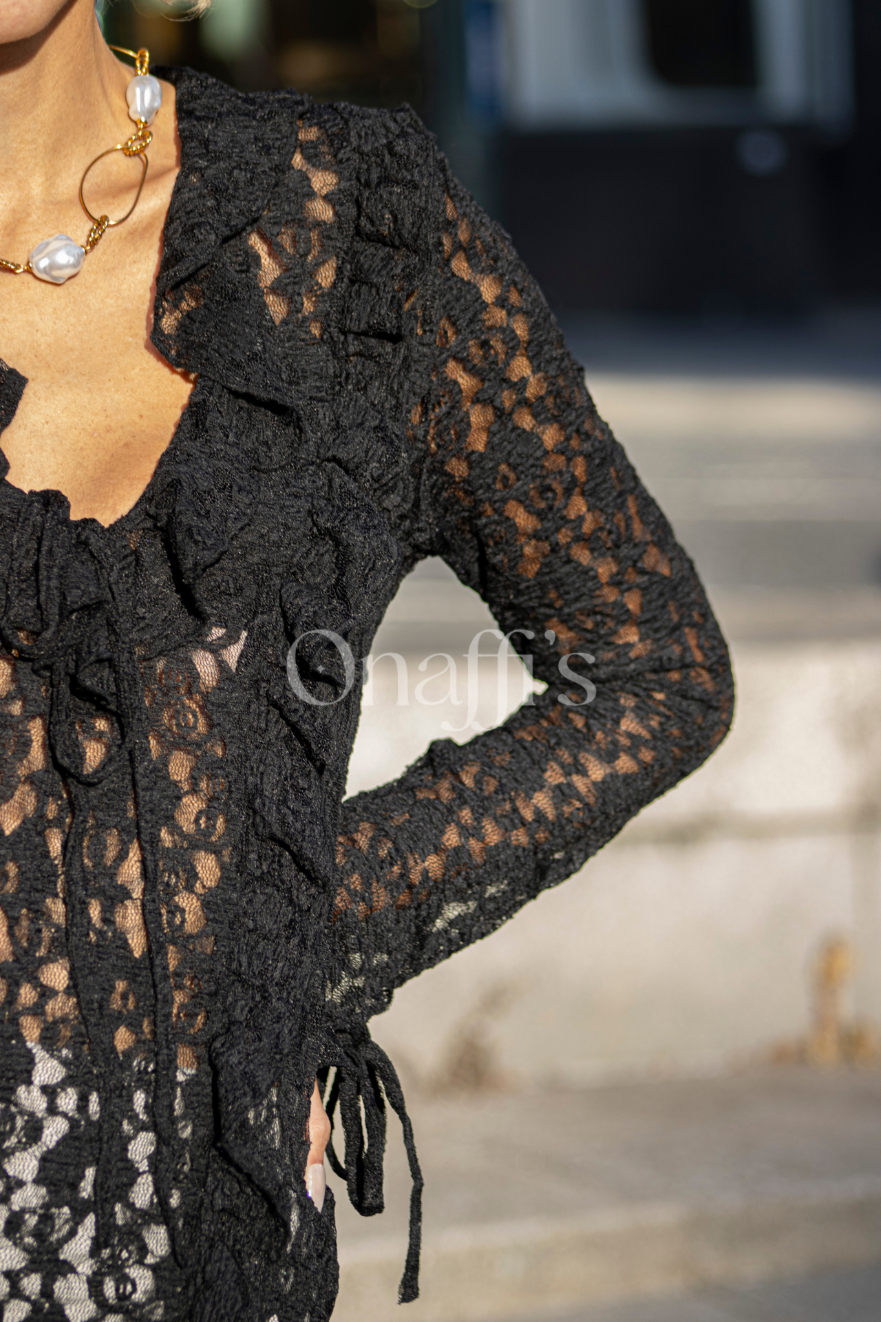 punho e detalhe de folhos também em renda na gola e que acompanham até ao final