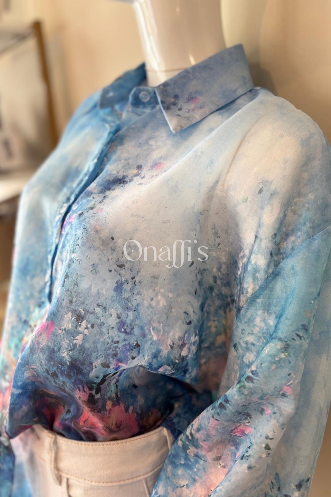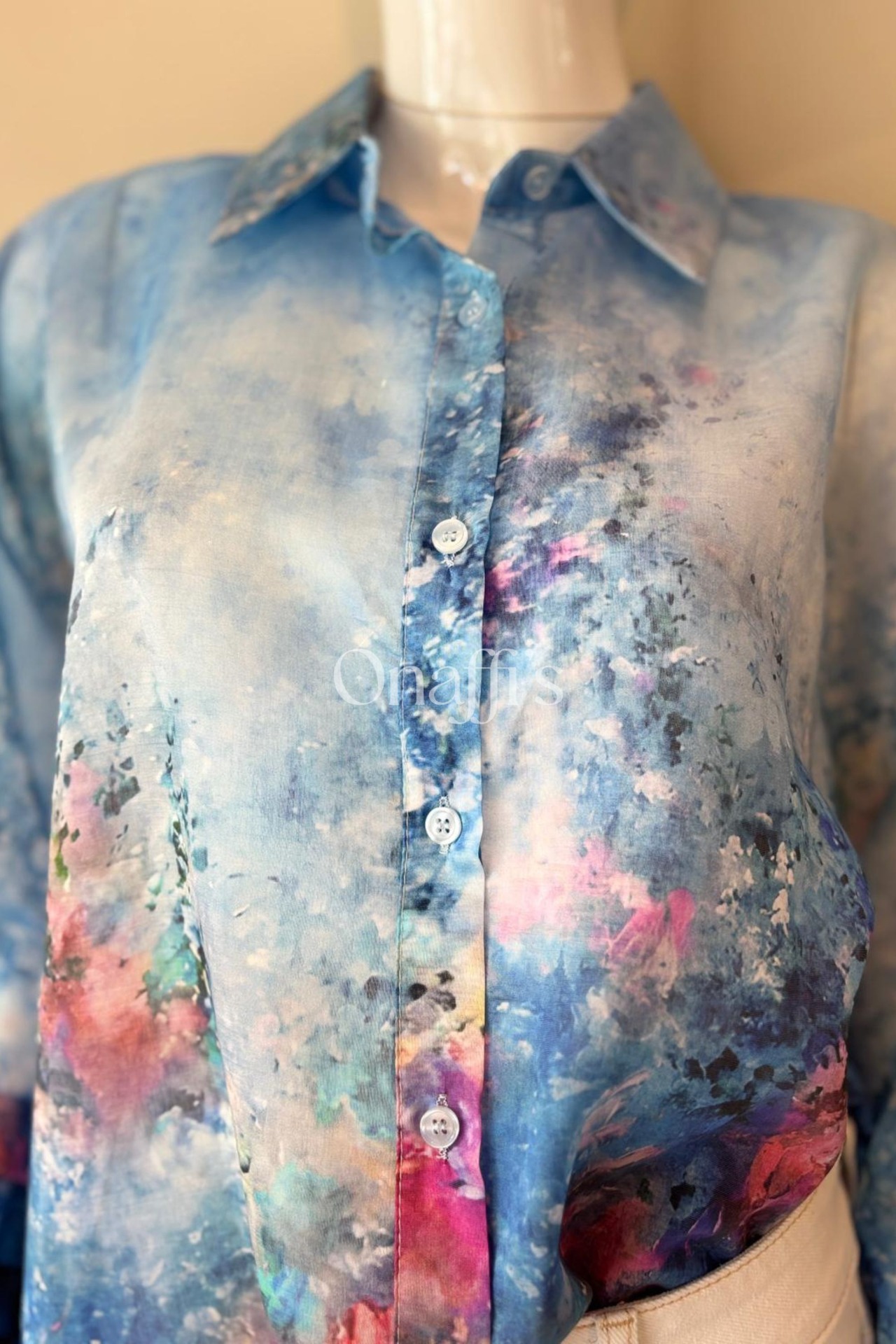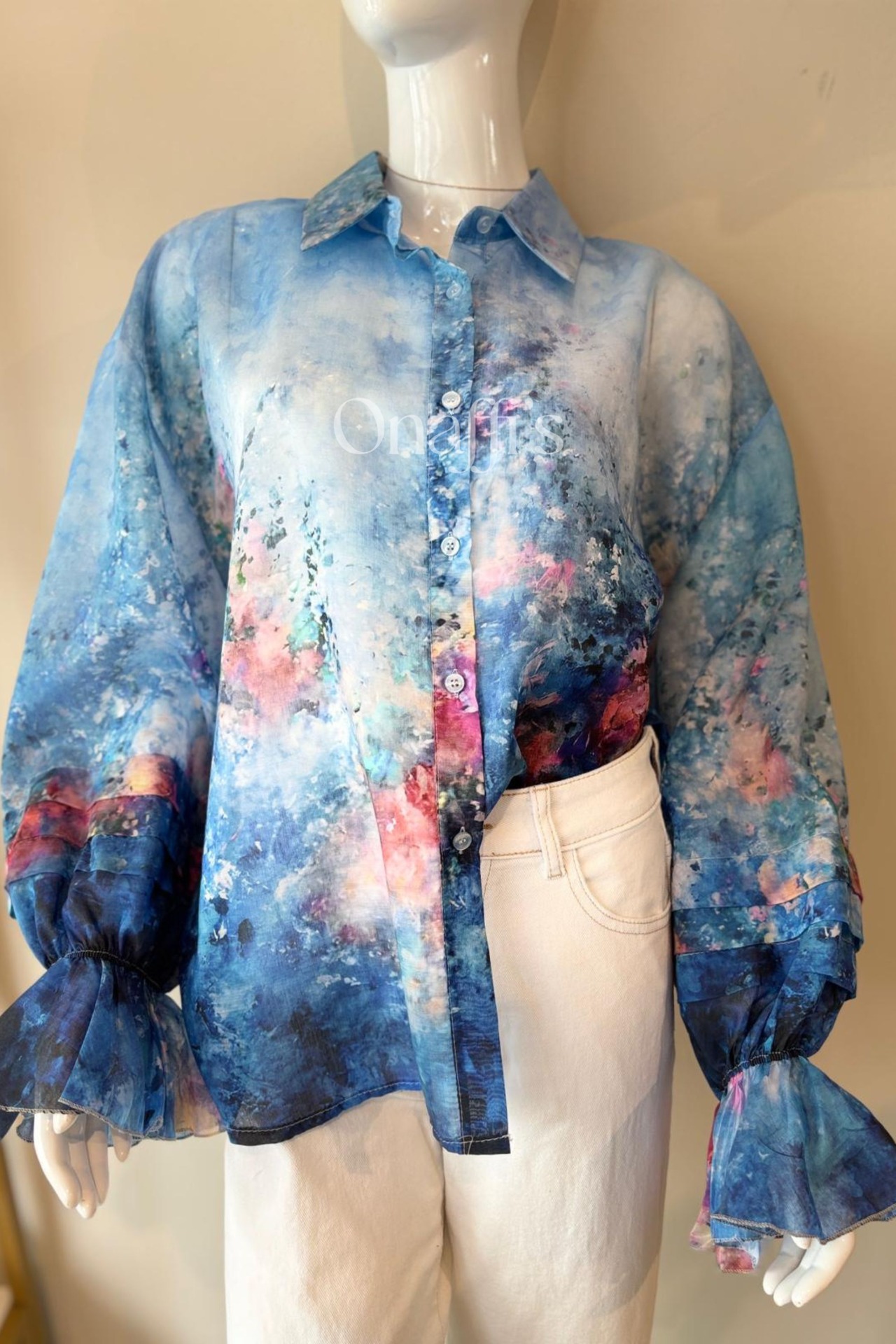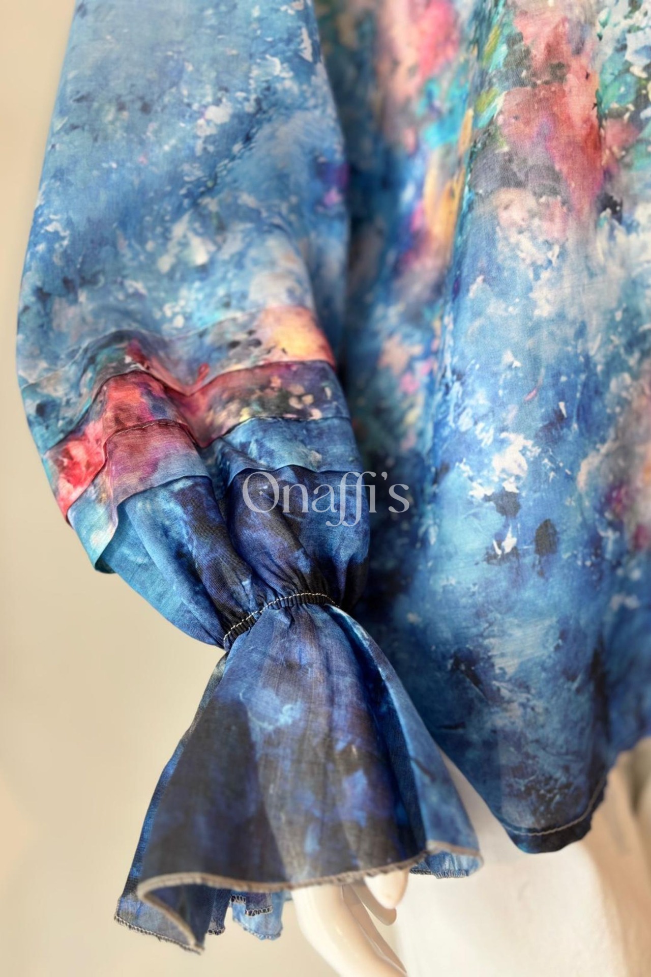 Esta camisa distingue-se pelas mangas volumosas e dramáticas, terminadas em punhos elásticos ajustados, que criam um efeito de folho exuberante e cheio de movimento. O padrão, uma explosão de azul oceano com apontamentos vibrantes de fúcsia, coral e amarelo, evoca a liberdade e a energia da natureza.