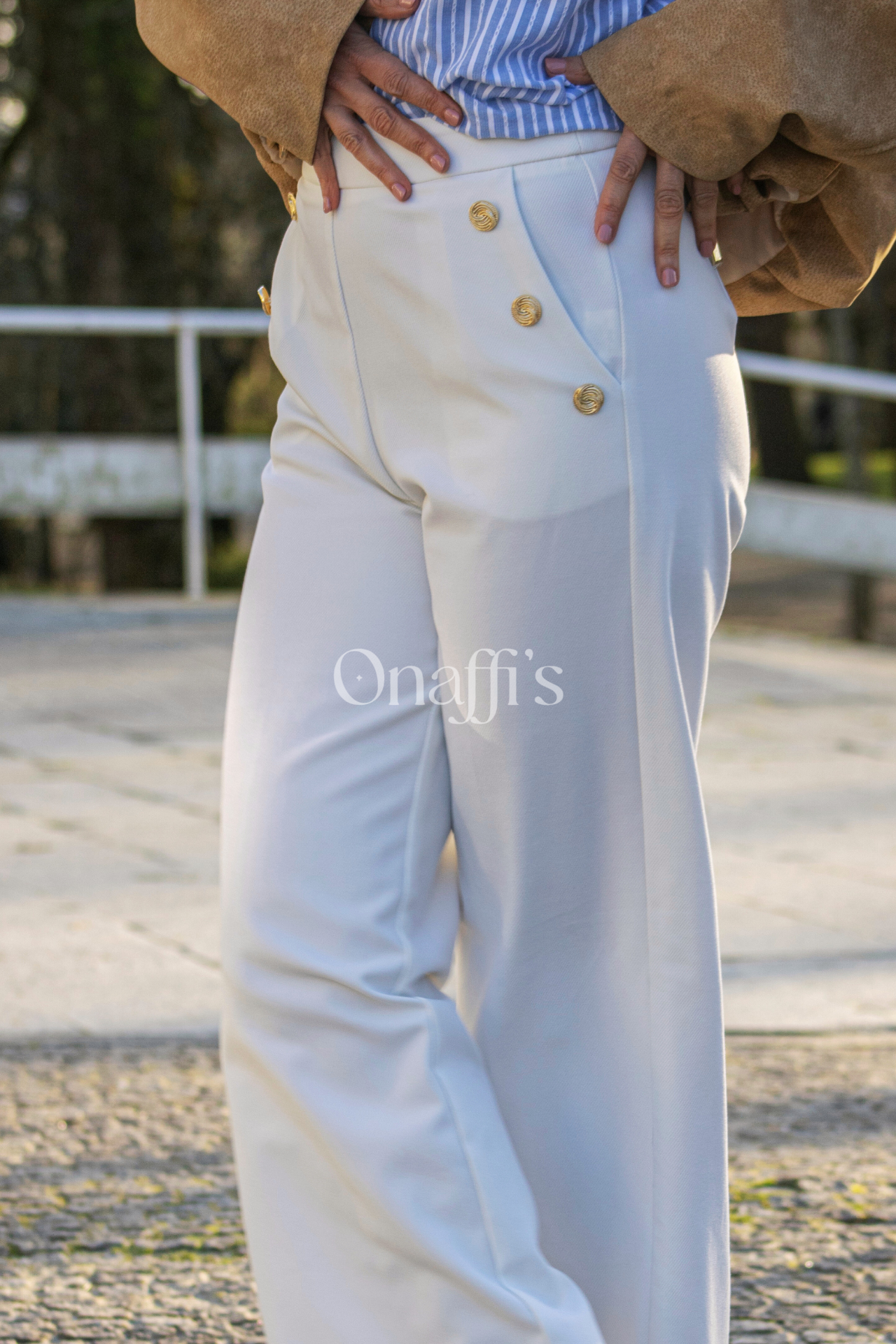 Em branco imaculado, estas calças de alfaiataria são a base perfeita para um look sofisticado e luminoso. O grande destaque são os botões dourados trabalhados, que funcionam como verdadeiras joias na peça, conferindo-lhe um ar de autoridade e requinte.