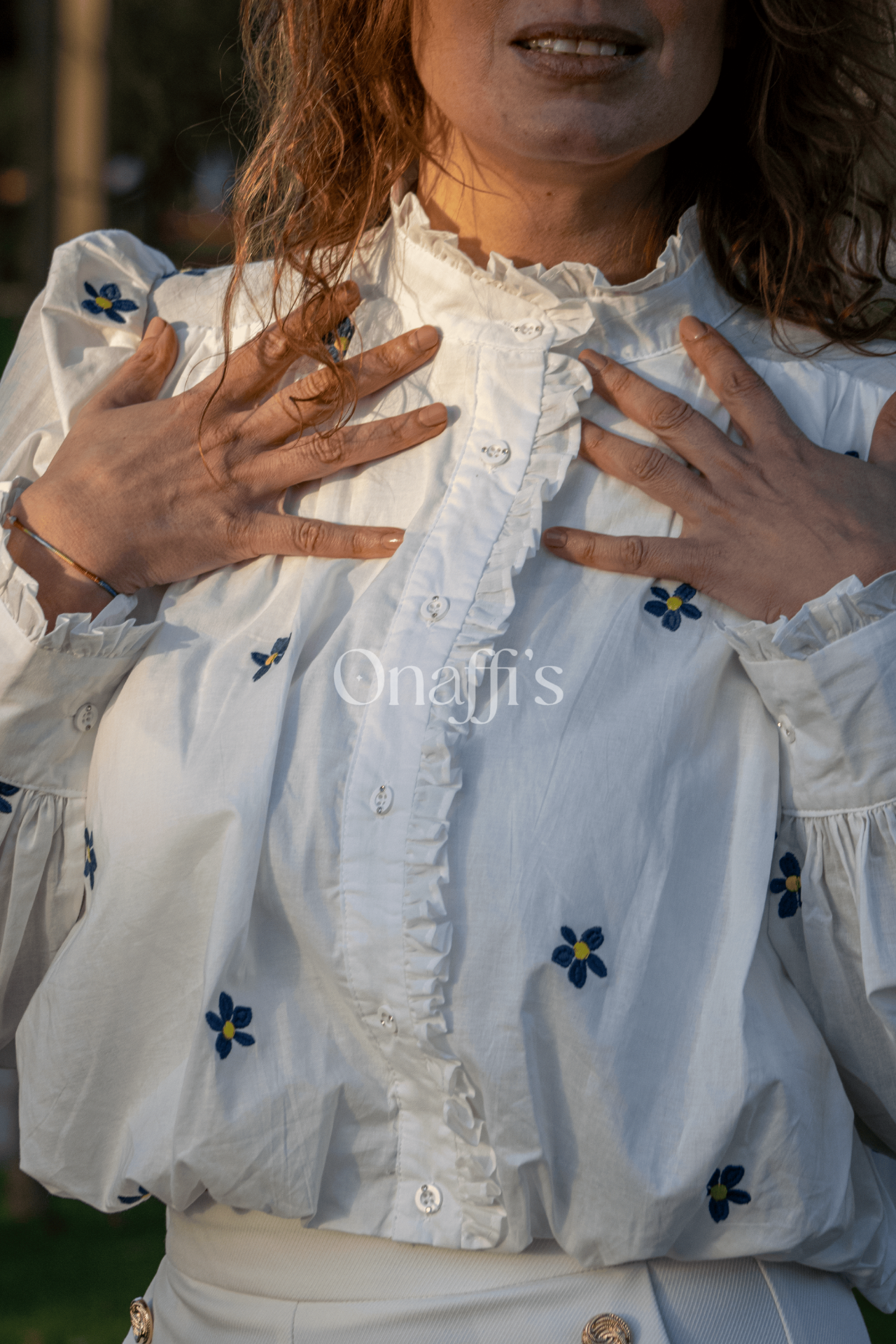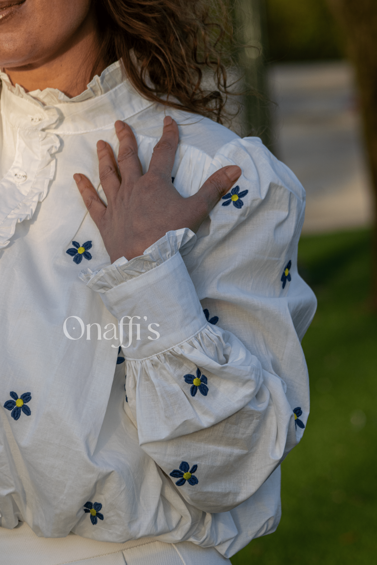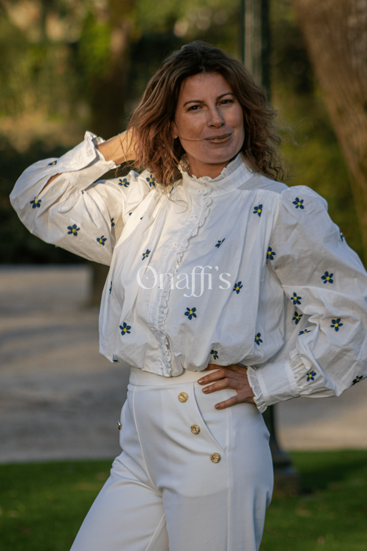 A nossa camisa branca é uma ode à feminilidade e ao trabalho artesanal. Com uma gola vitoriana ricamente trabalhada e mangas que são verdadeiras obras de arte, esta peça traz a leveza da primavera para o seu guarda-roupa com uma sofisticação sem esforço.