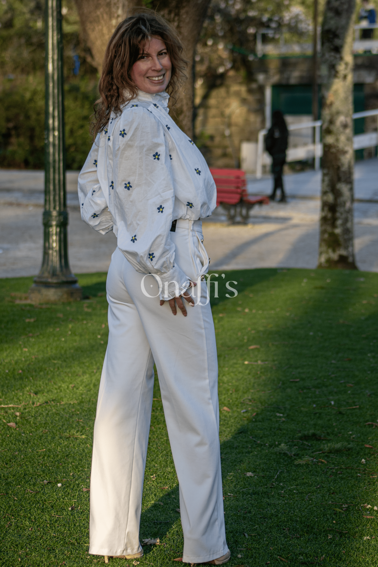 Gola de Destaque: Gola alta trabalhada com bordados perfurados, ideal para usar sob blazers ou malhas, deixando apenas o detalhe à vista.