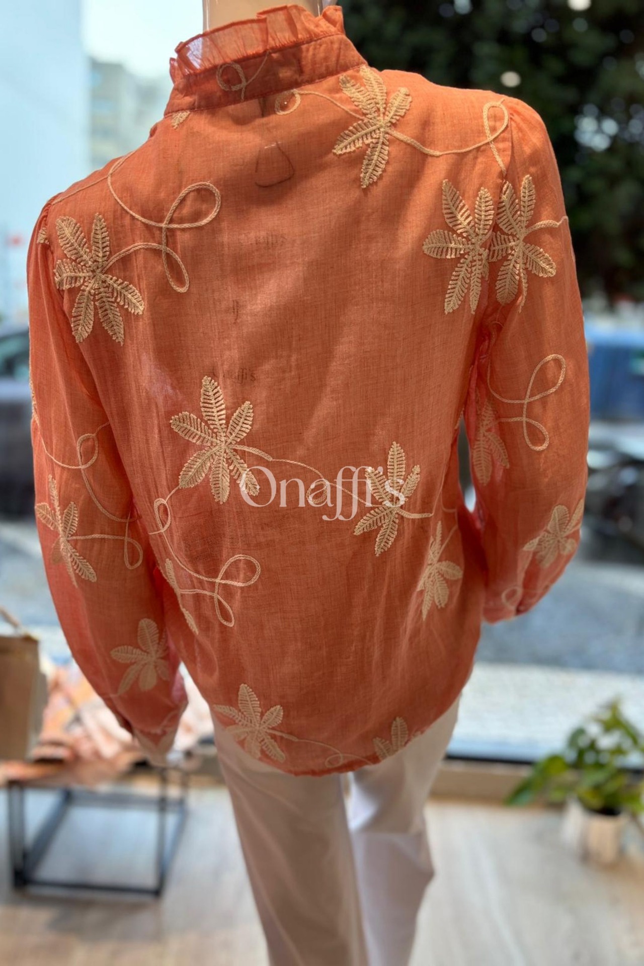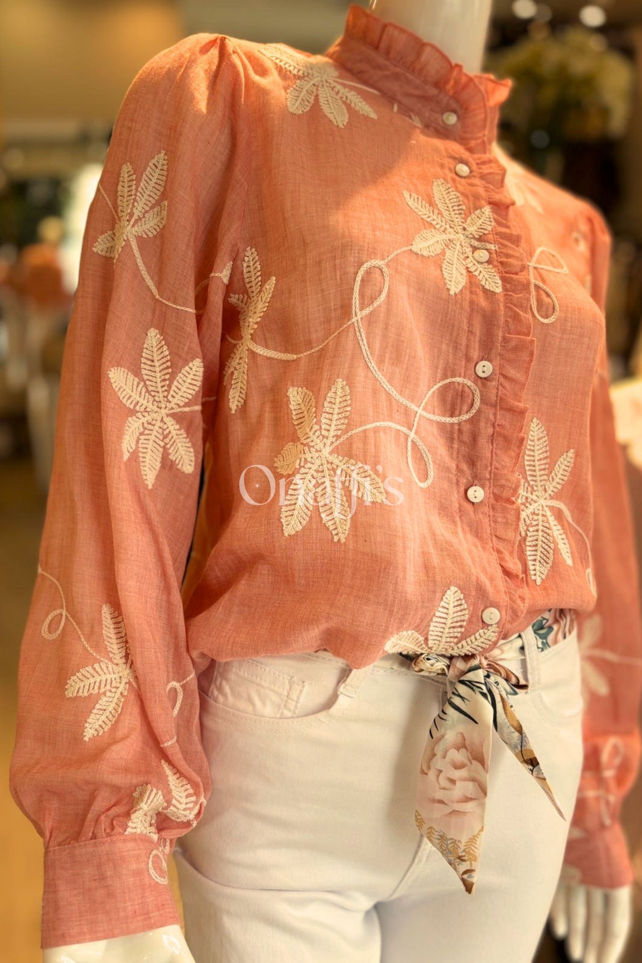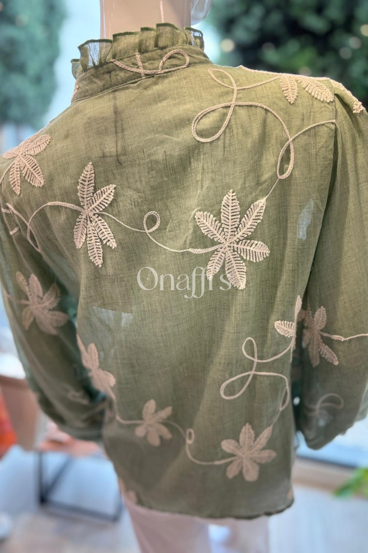 Bordado Floral em Relevo: Padrões botânicos minuciosos em tons creme que percorrem a frente e as mangas, criando uma textura rica e um visual artesanal de alta qualidade.