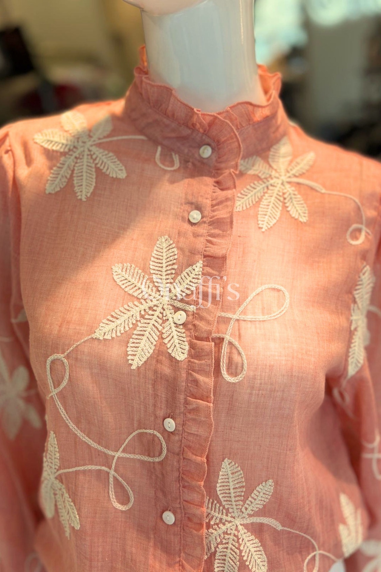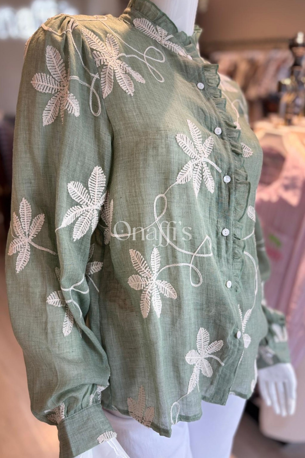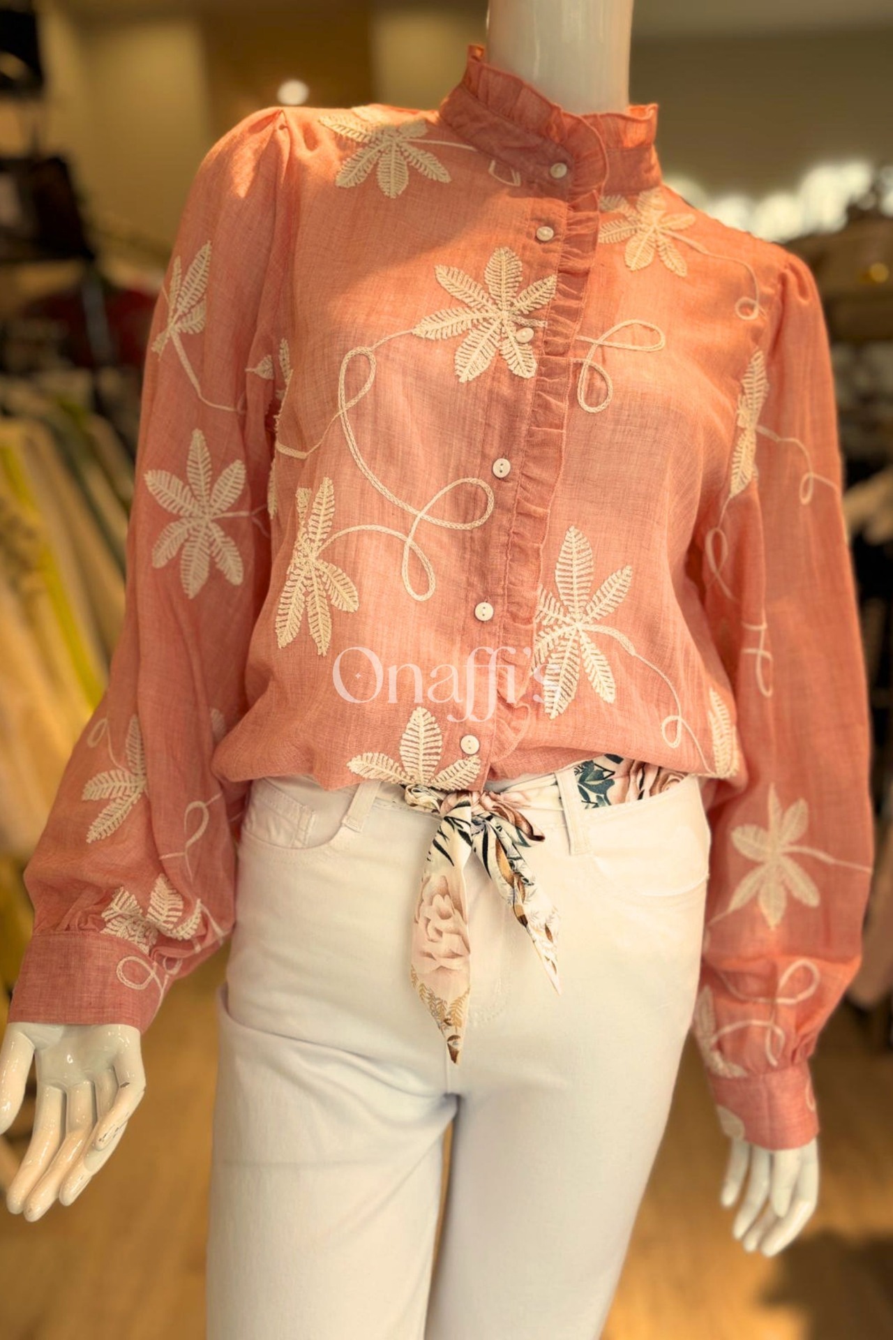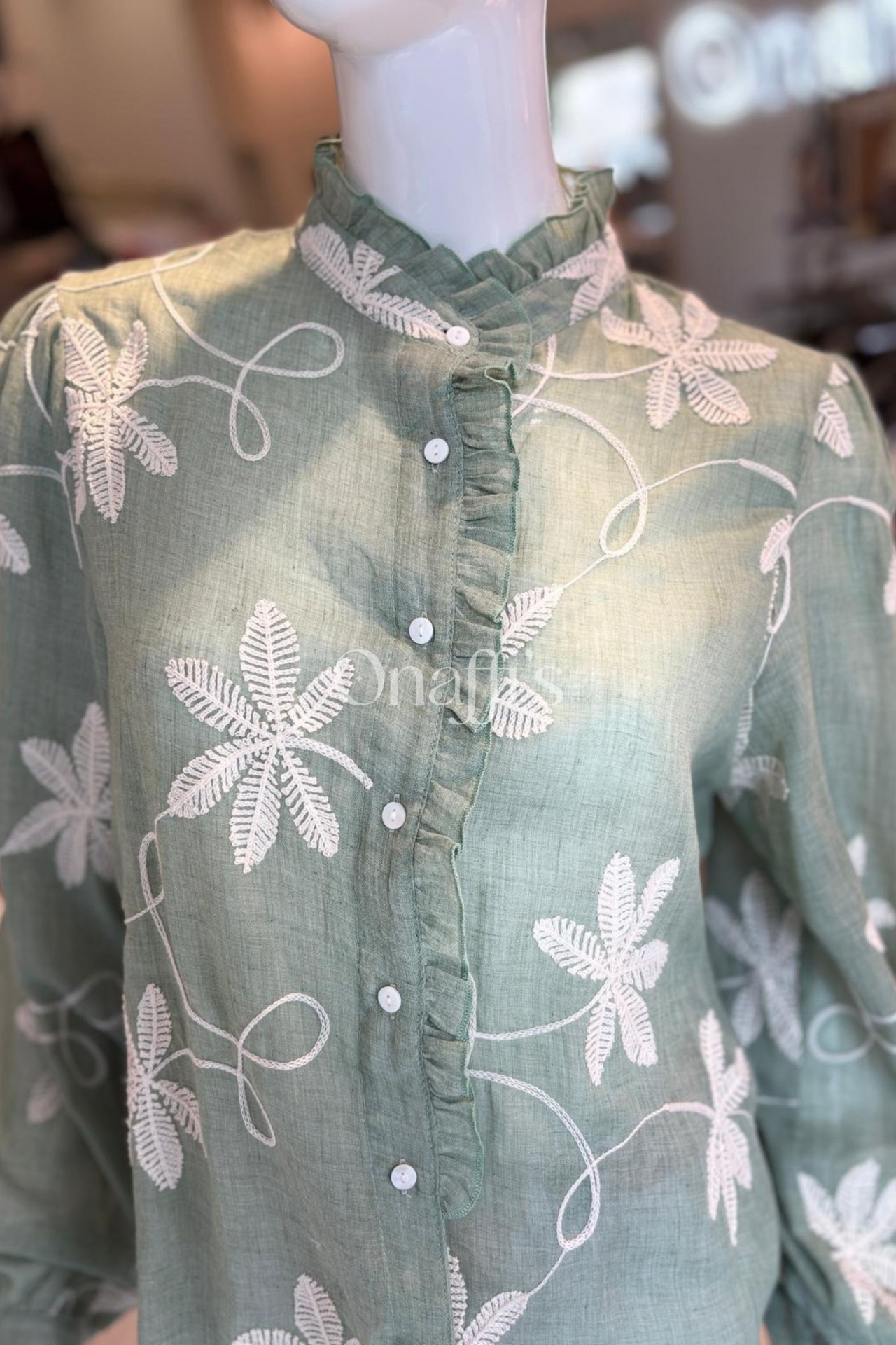Bordado Floral em Relevo: Padrões botânicos minuciosos em tons creme que percorrem a frente e as mangas, criando uma textura rica e um visual artesanal de alta qualidade.