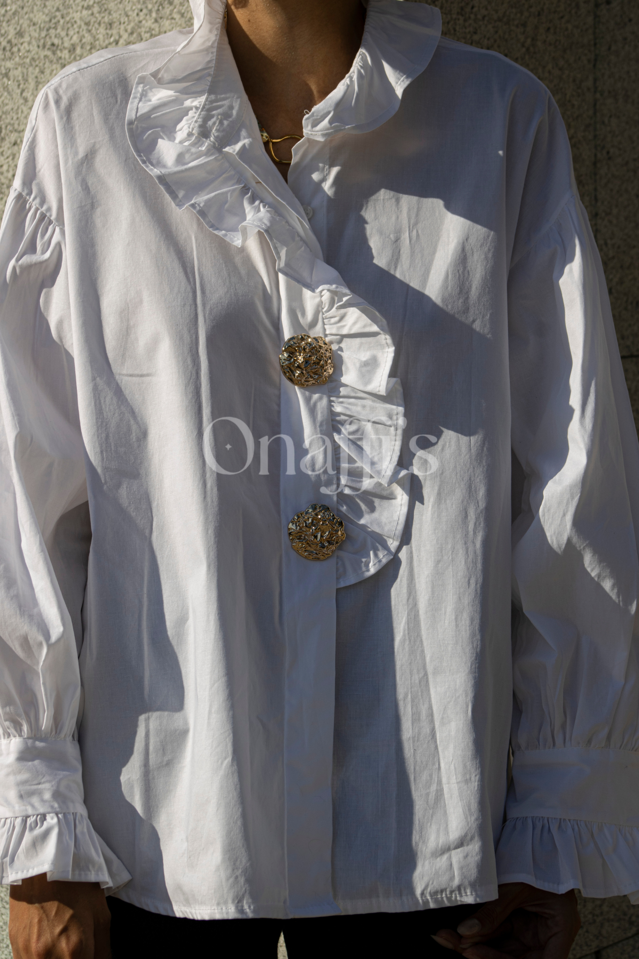 Camisa de manga comprida com detalhe de folhos no punho e na gola, que continua para a zona central do peito. Possui abotoamento central e apontamentos fantasia dourados.