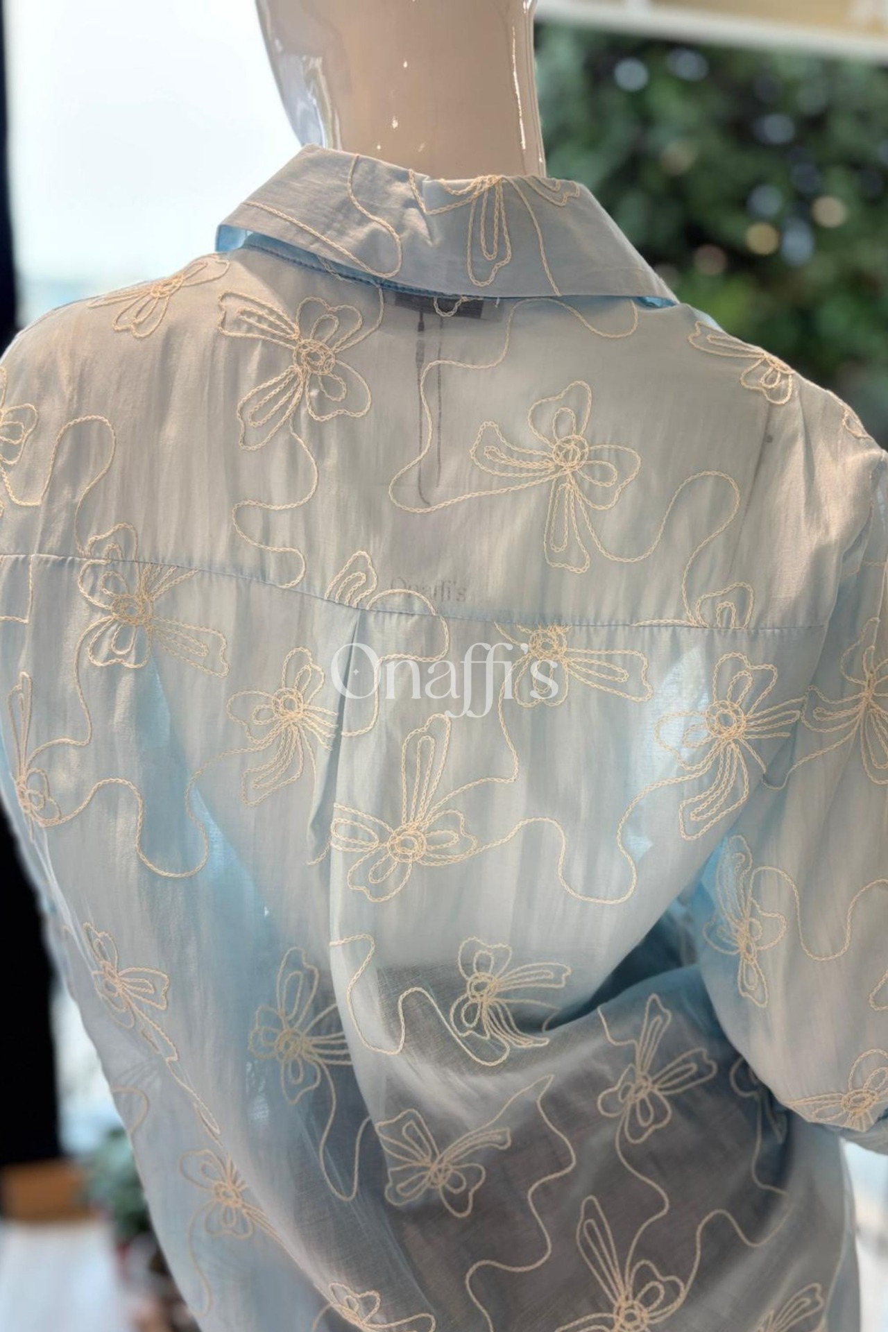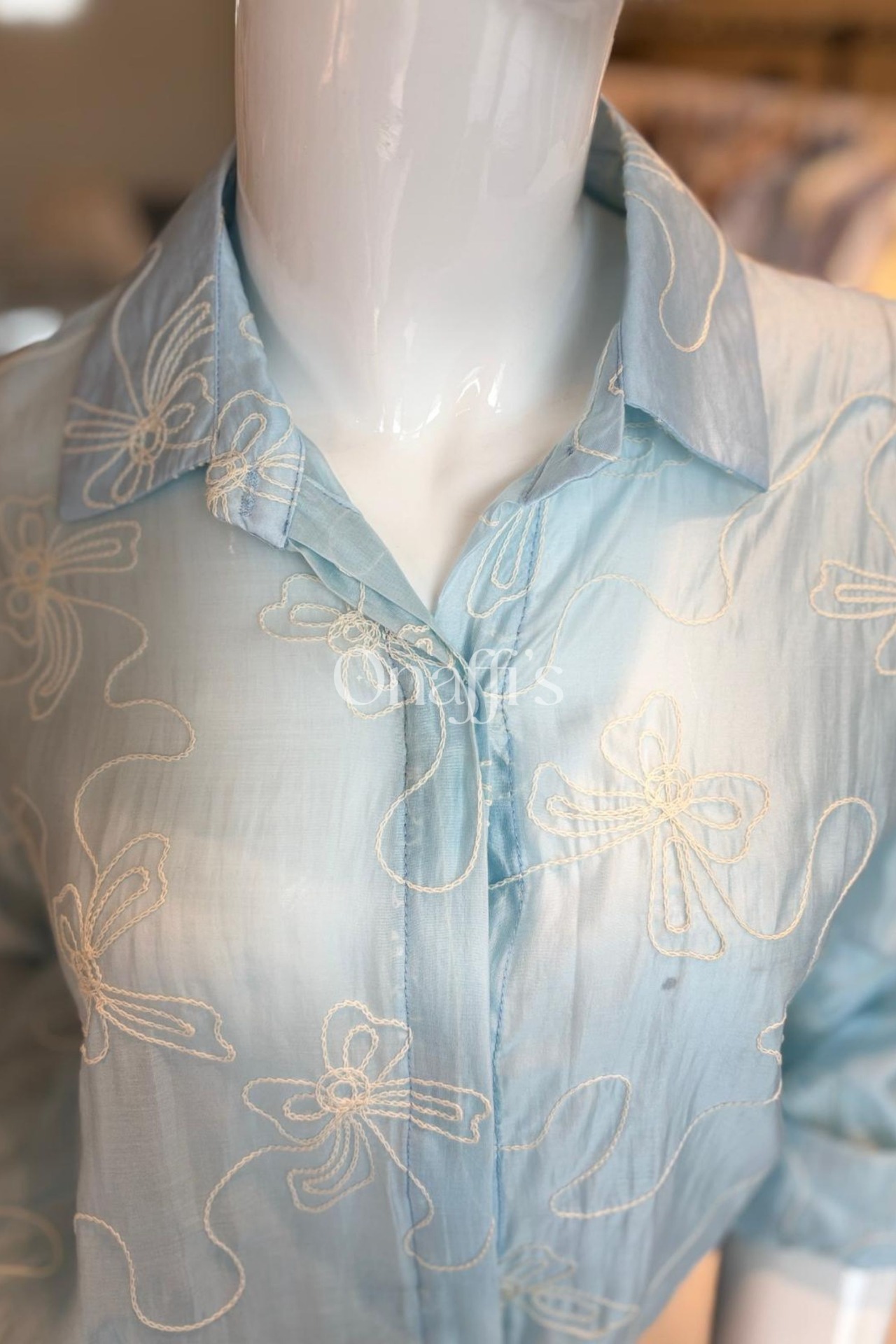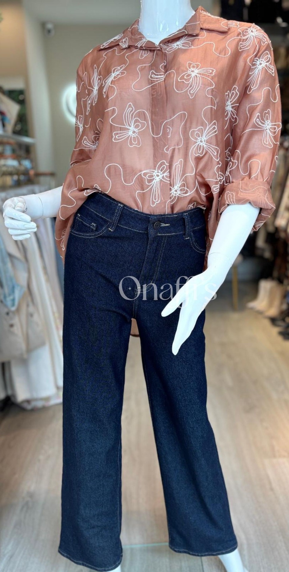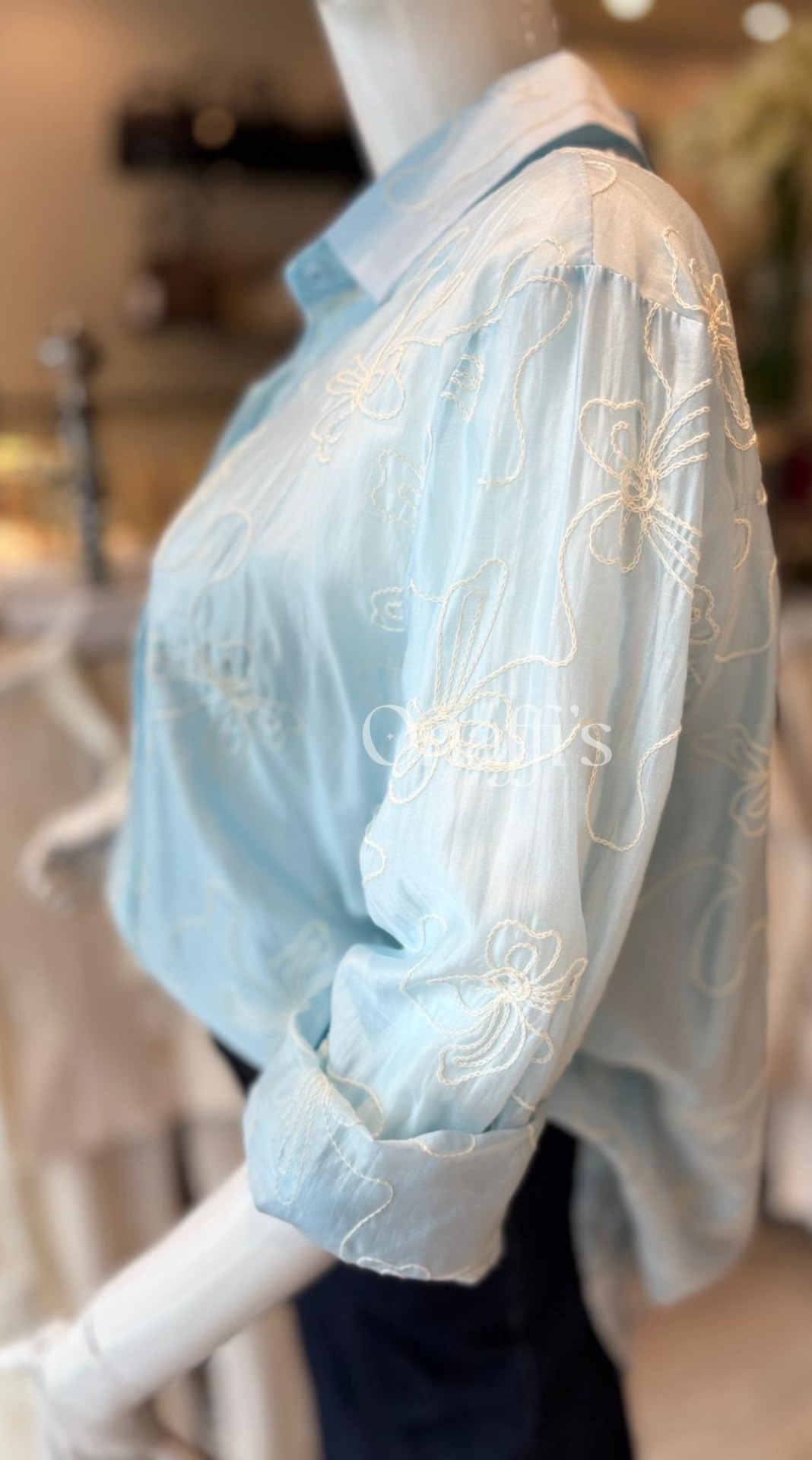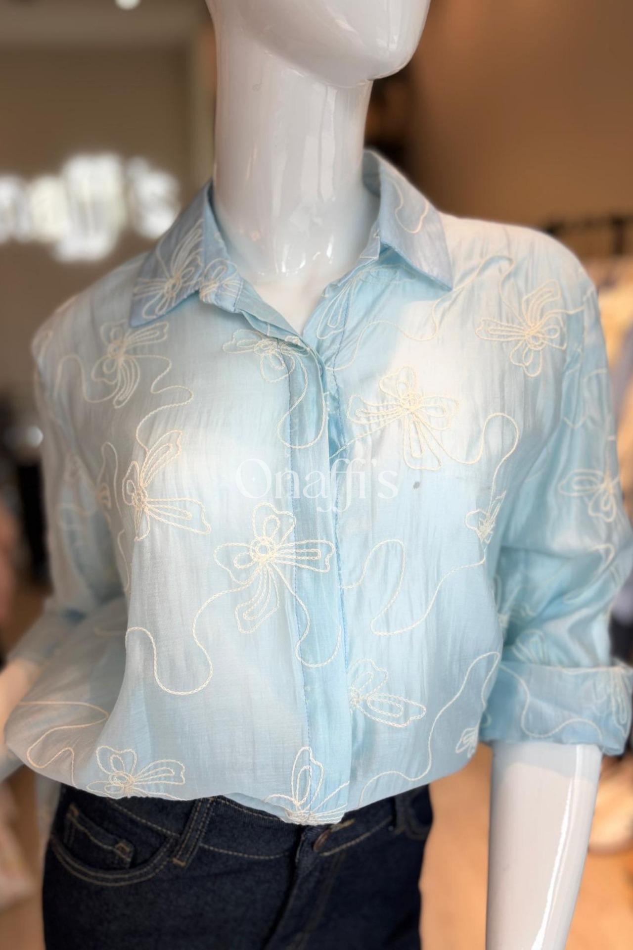 Esta camisa combinado um tecido levemente transparente com um bordado floral contrastante que exala feminilidade e estilo. O seu design leve e os detalhes em renda (croché) nas mangas e na gola conferem-lhe um ar romântico e vintage, ideal para quem gosta de peças com alma e história.