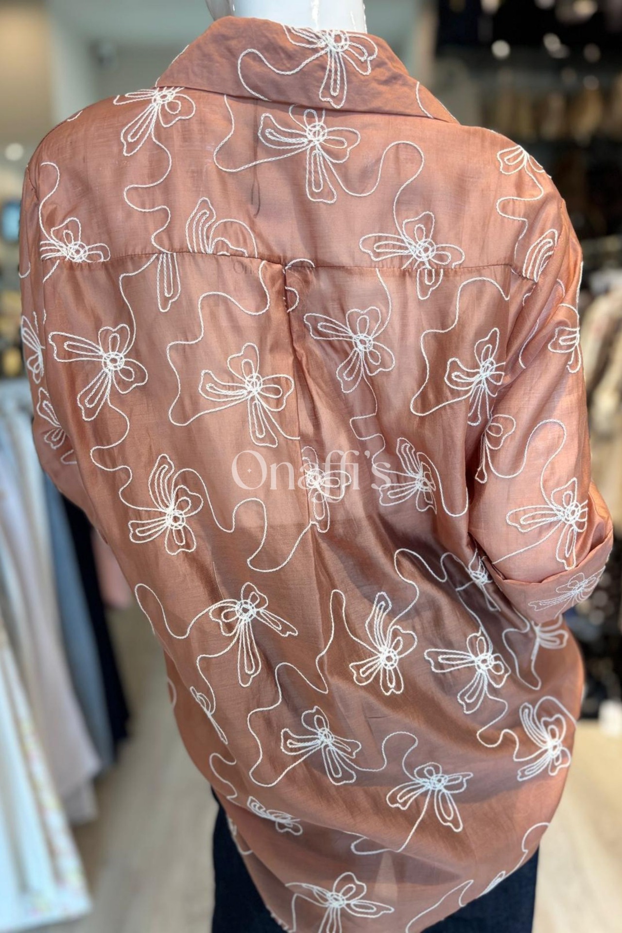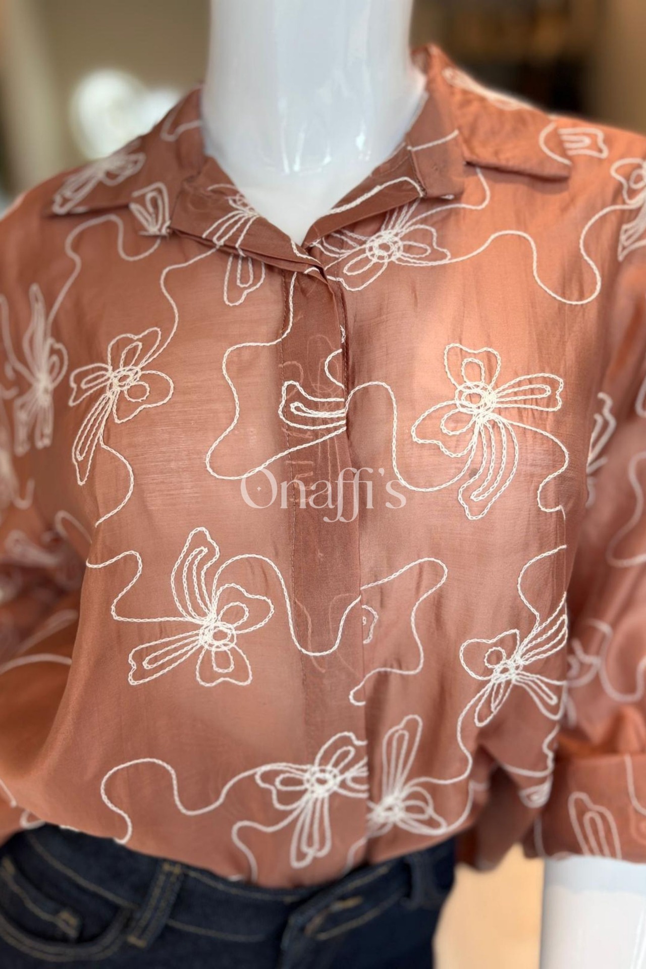 Bordado Floral Contrastante: Flores delicadas em tons de creme que se destacam sobre o fundo terracota, criando um ponto focal elegante no peito.