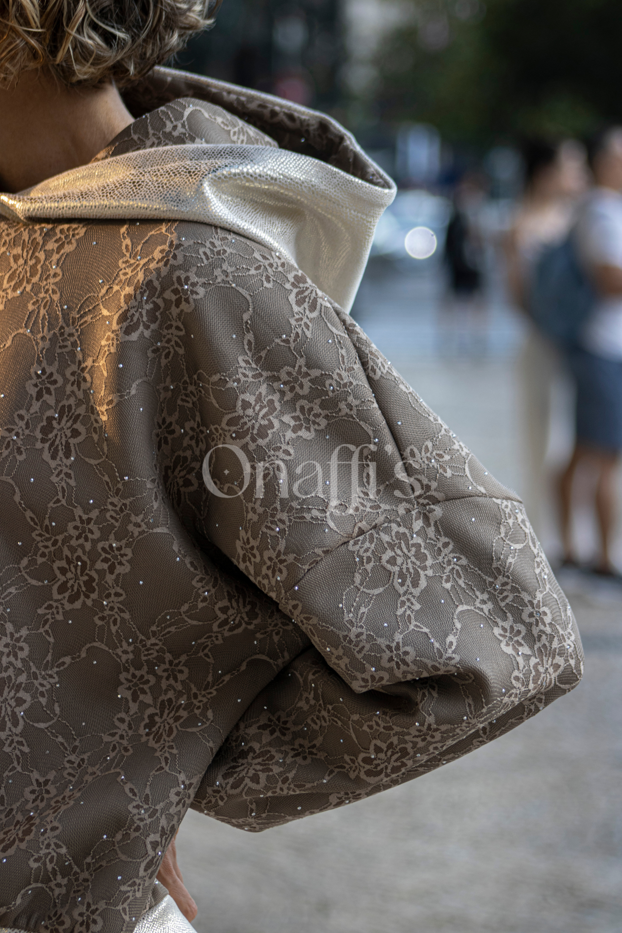 tecido motivo imitação renda com apontamentos em brilhos. Se conjugada com a