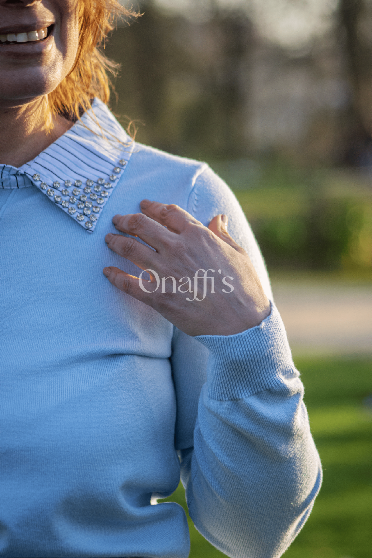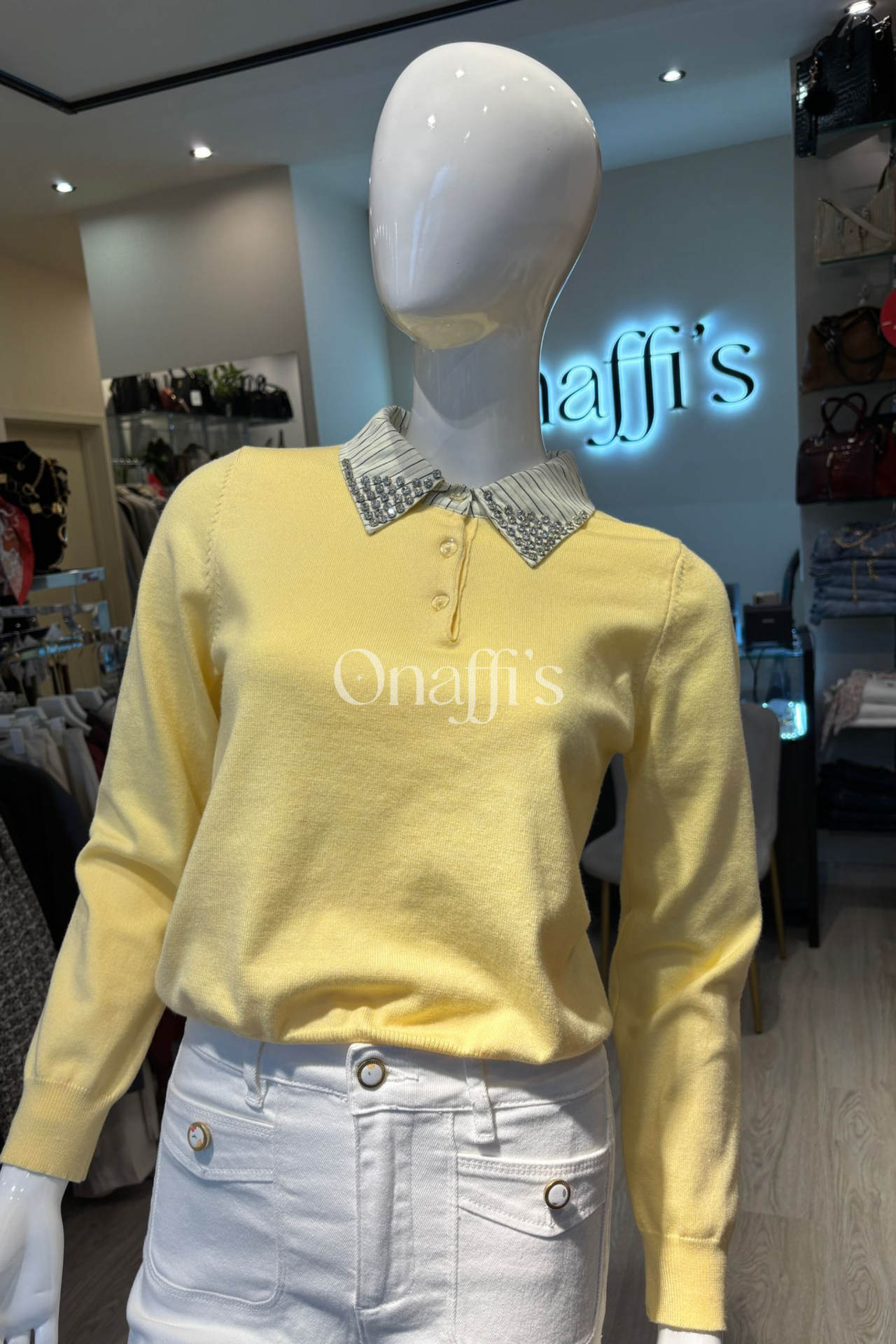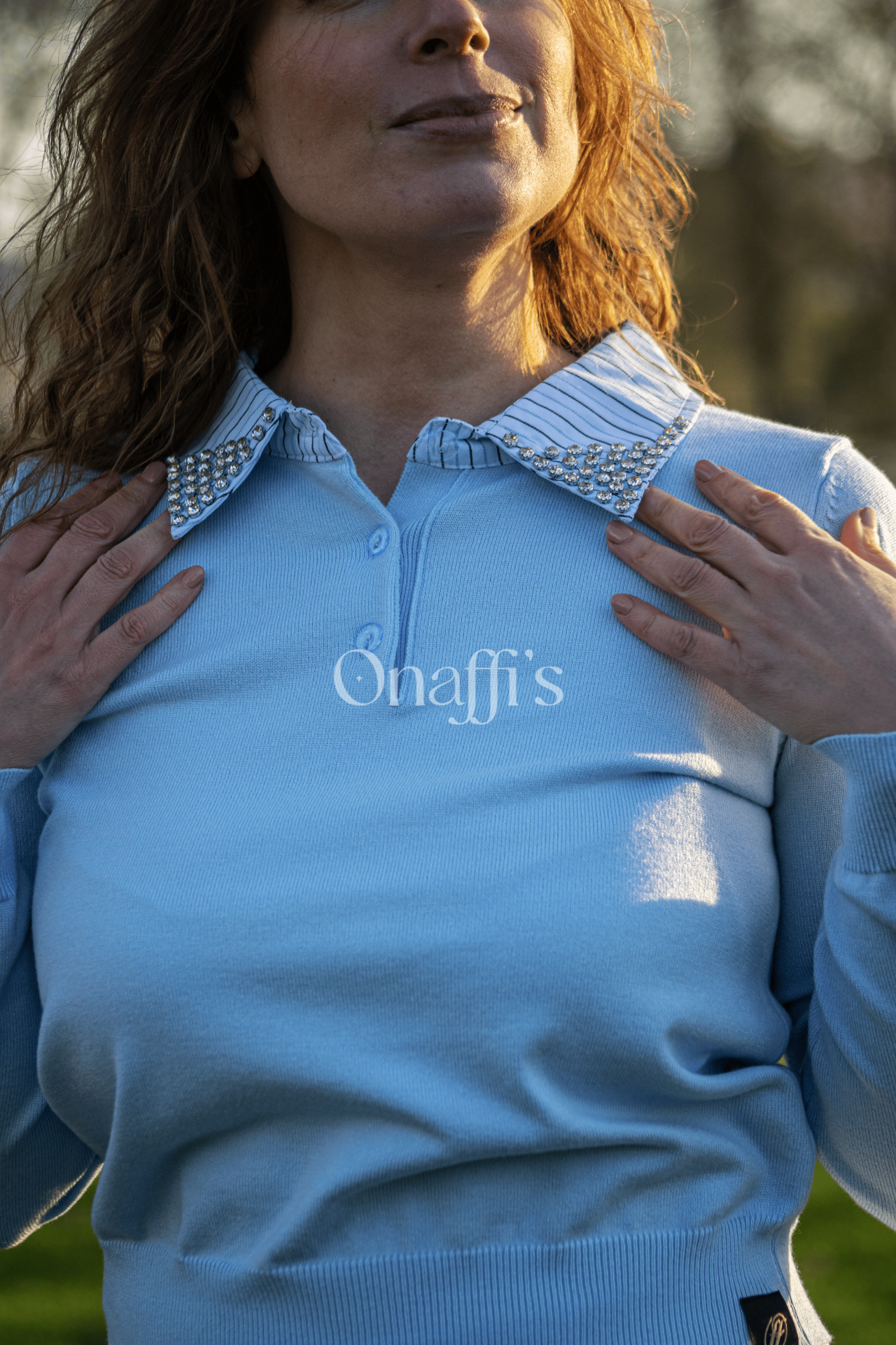 A nossa nova camisola estilo polo, em malha fina num delicado azul céu, é a síntese perfeita entre conforto e elegância urbana. O grande destaque está na gola dupla, onde o colarinho de camisa listrado assenta sobre a base em malha, ambos realçados por fileiras de cristais que iluminam o look com sofisticação.