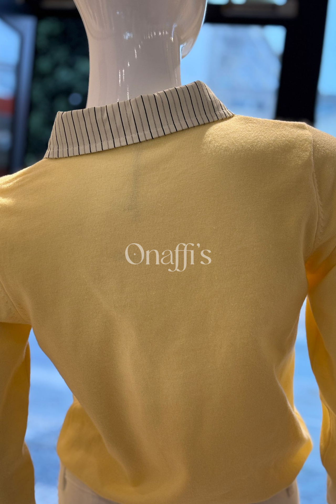 - Contraste de Texturas: A suavidade da malha fina contrasta com a estrutura do colarinho listrado, criando um visual moderno e sofisticado.