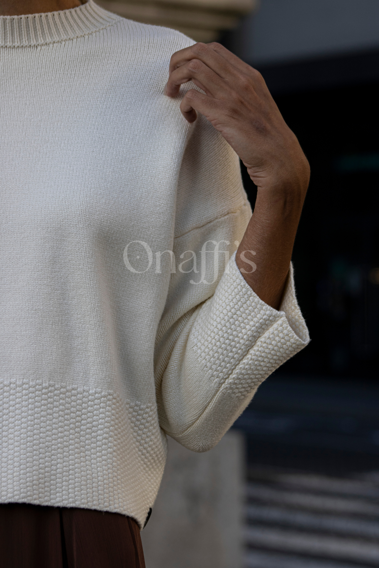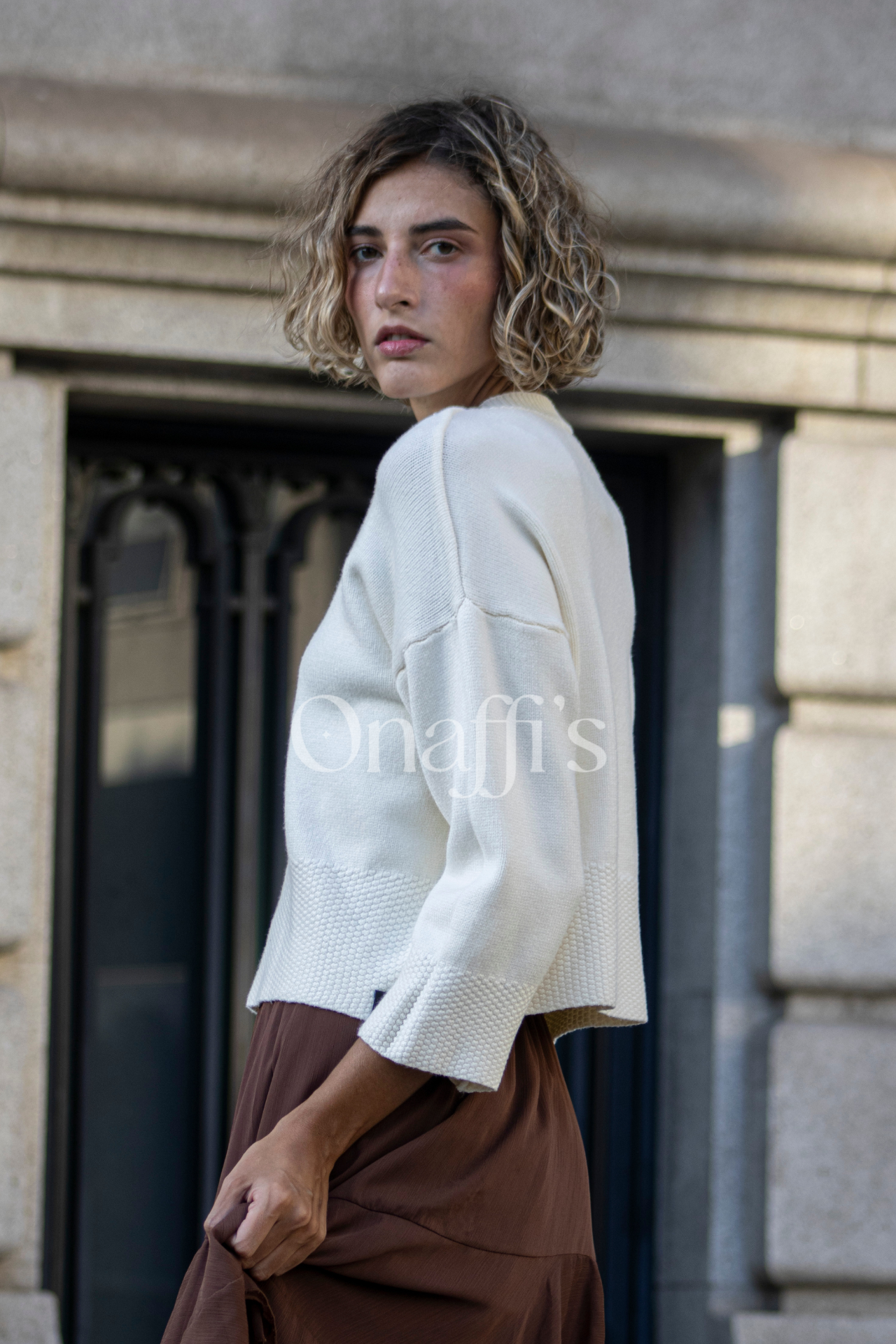 Camisola de manga 3/4 e gola redonda. Possui um padrão