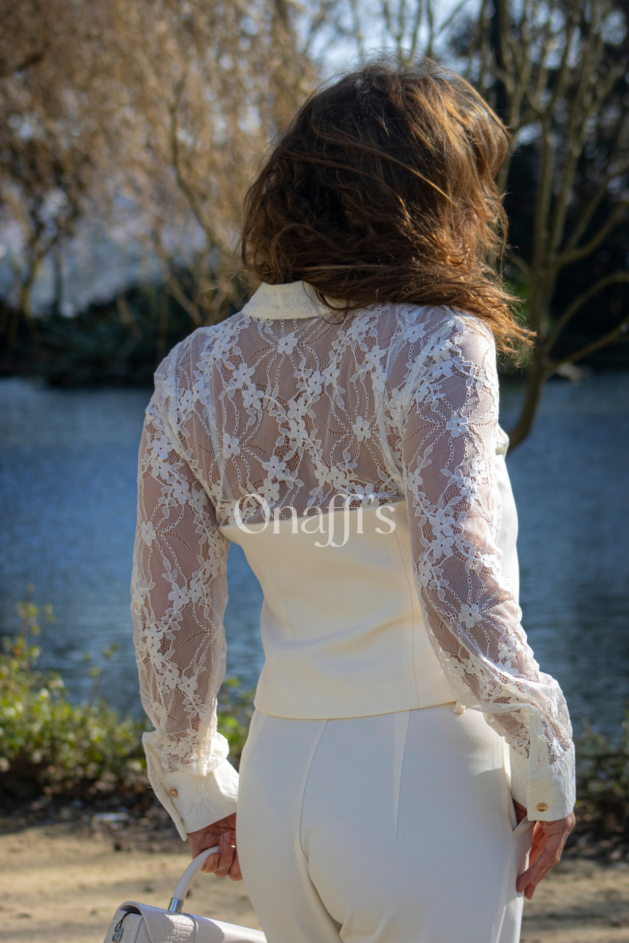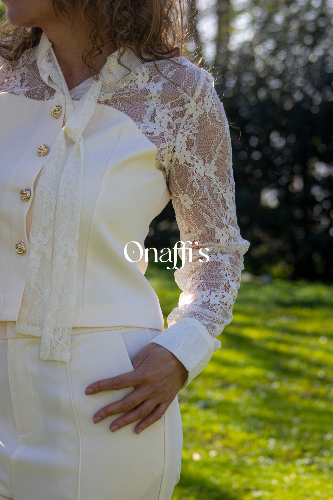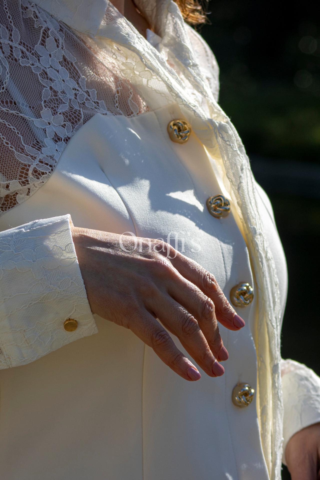 A essência da feminilidade contemporânea. Este casaco estruturado destaca-se pela fusão perfeita entre a alfaiataria clássica e a delicadeza da renda artesanal nas mangas e gola. Os botões dourados conferem um toque de joalharia a uma peça que exala luxo discreto. Ideal para elevar qualquer coordenado de primavera com uma distinção inigualável.