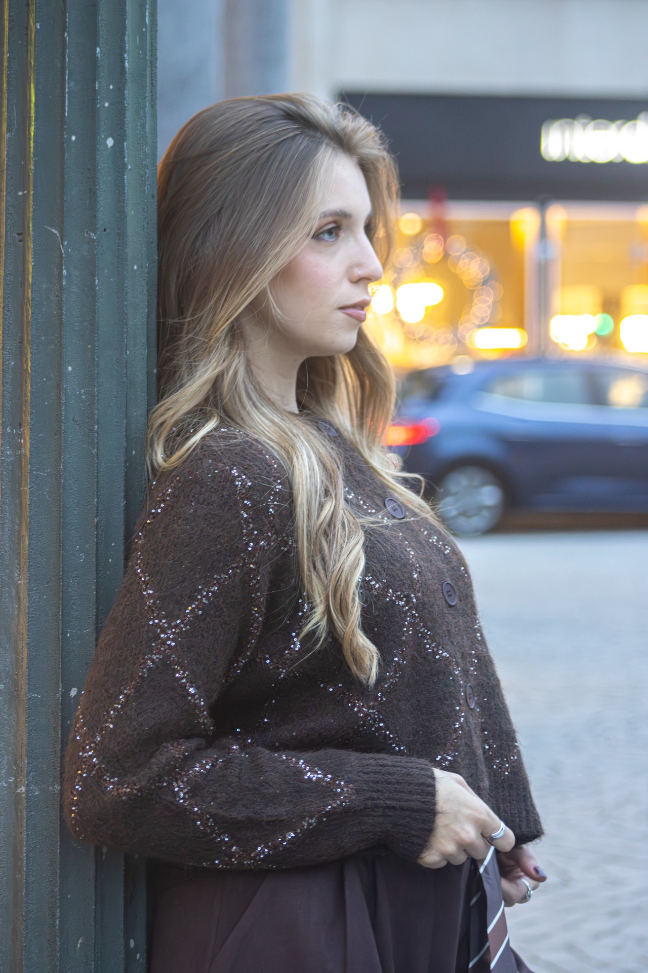 Casaco de malha com desenhos geométricos, com lantejoulas, abertura frontal com botões
