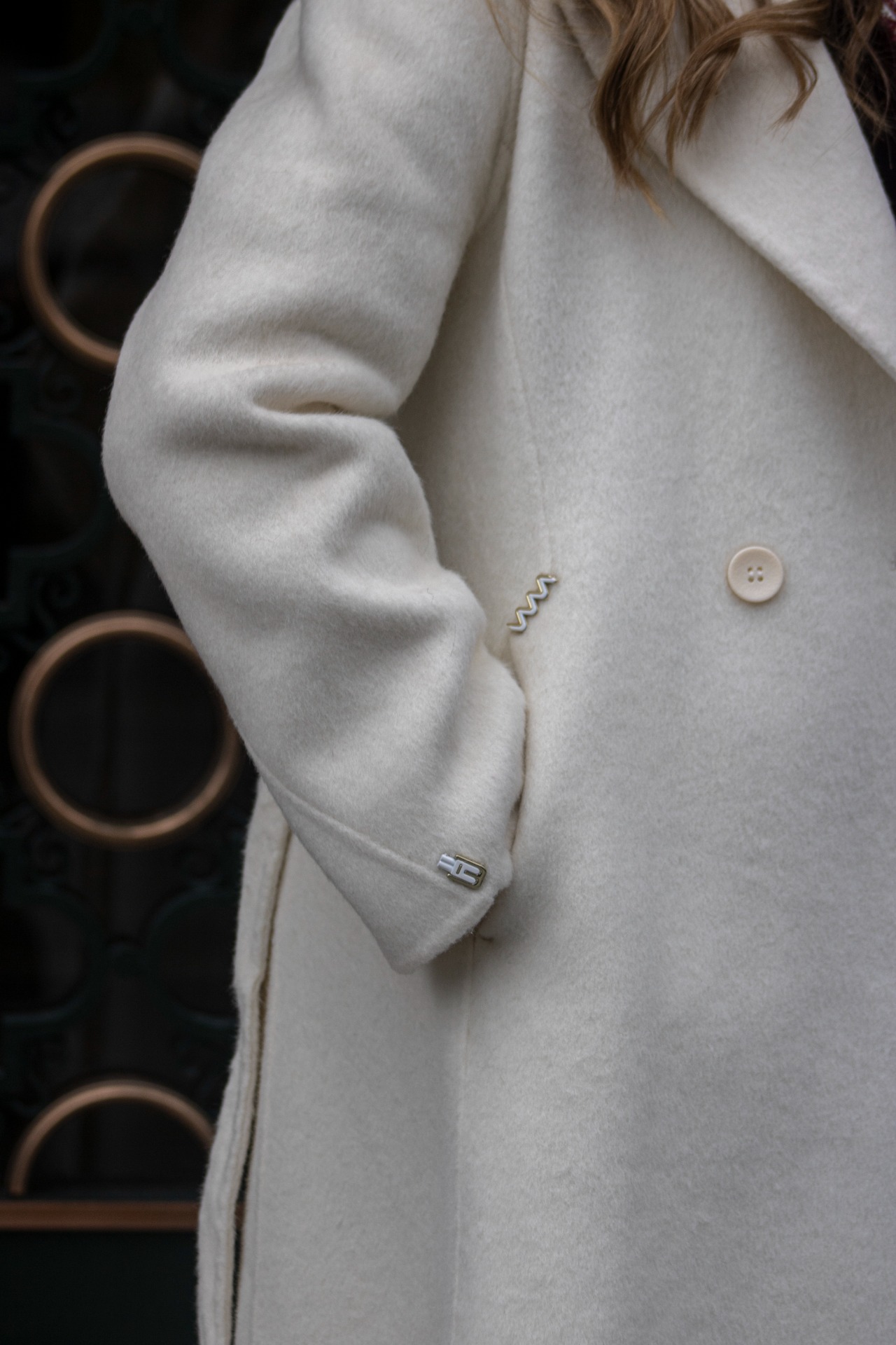 Casaco Comprido com gola de lapela, bolsos laterais, fecho com trespasse com botões e cinto.