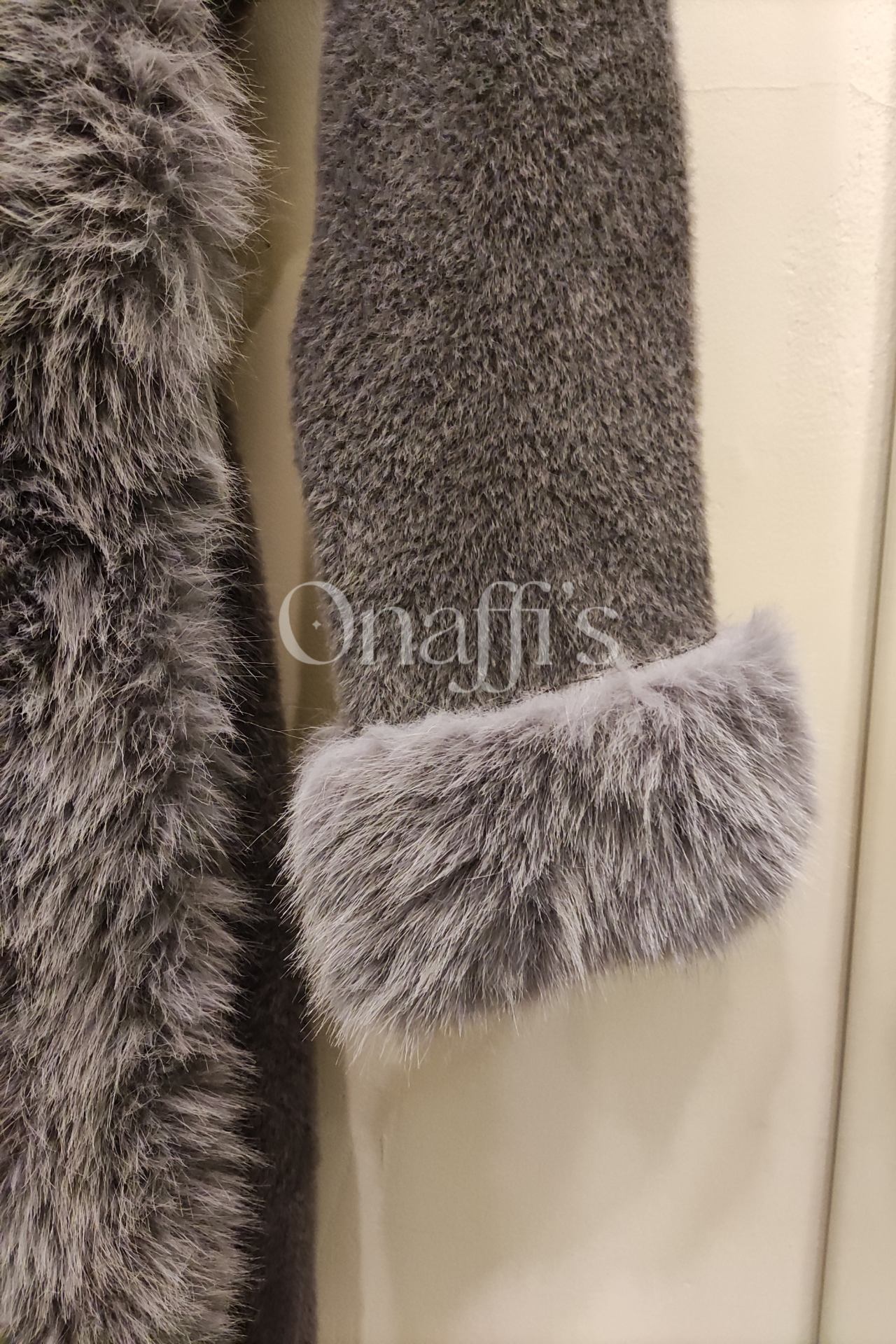 lapelas cobertas por detalhe de pêlo amovível. Apresenta também detalhe de pêlo