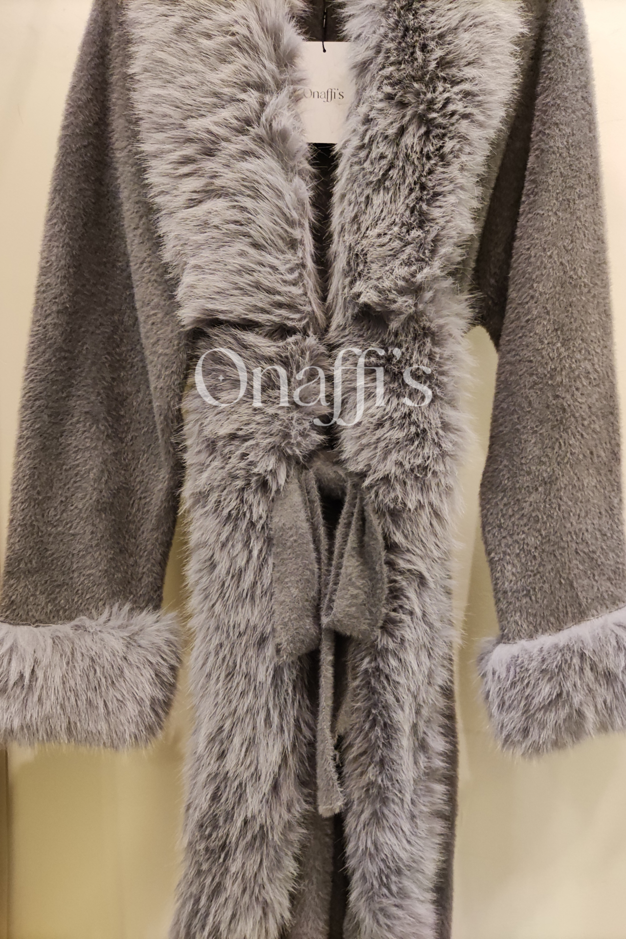 Casaco de malha cinzento, tamanho midi, gola em V com