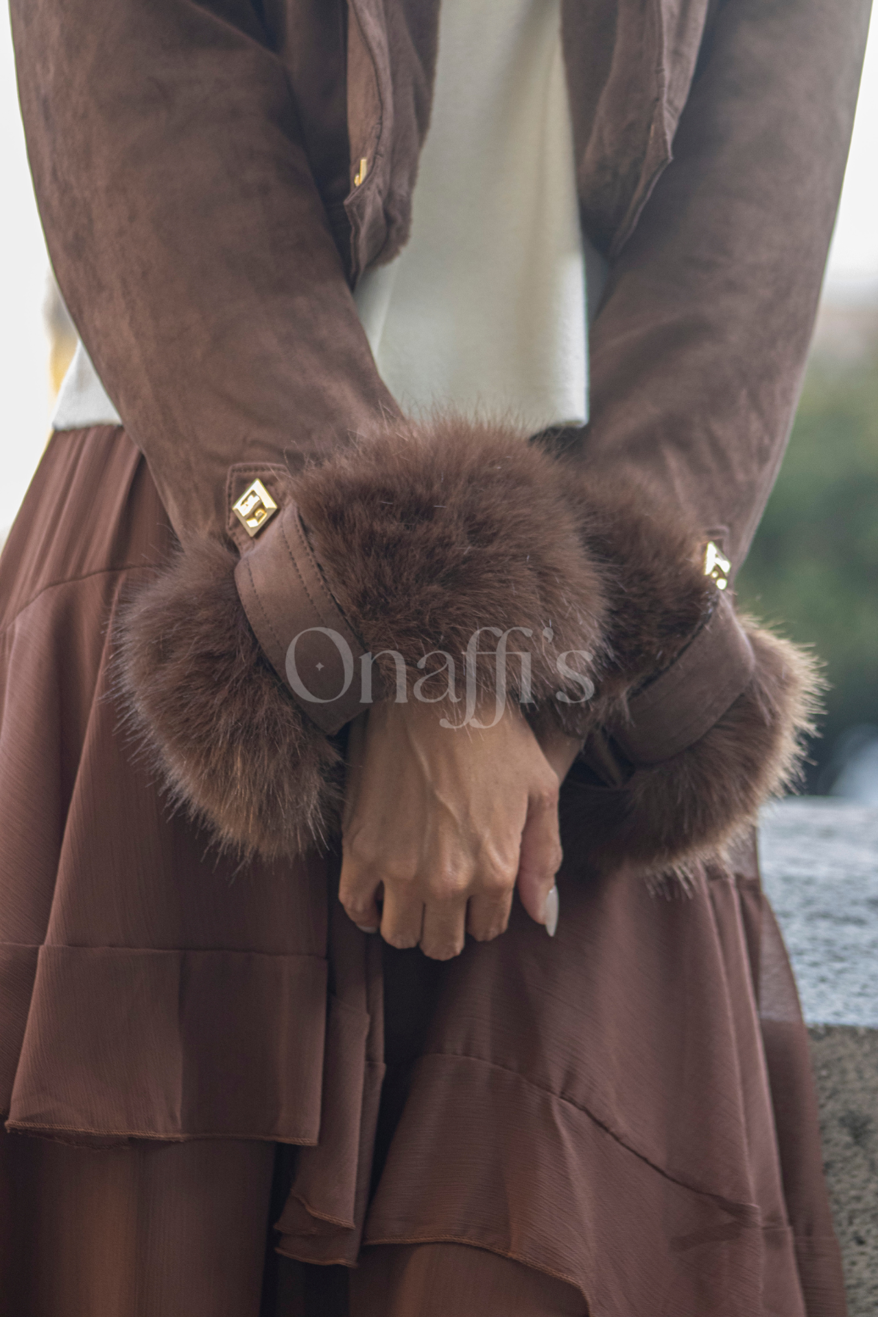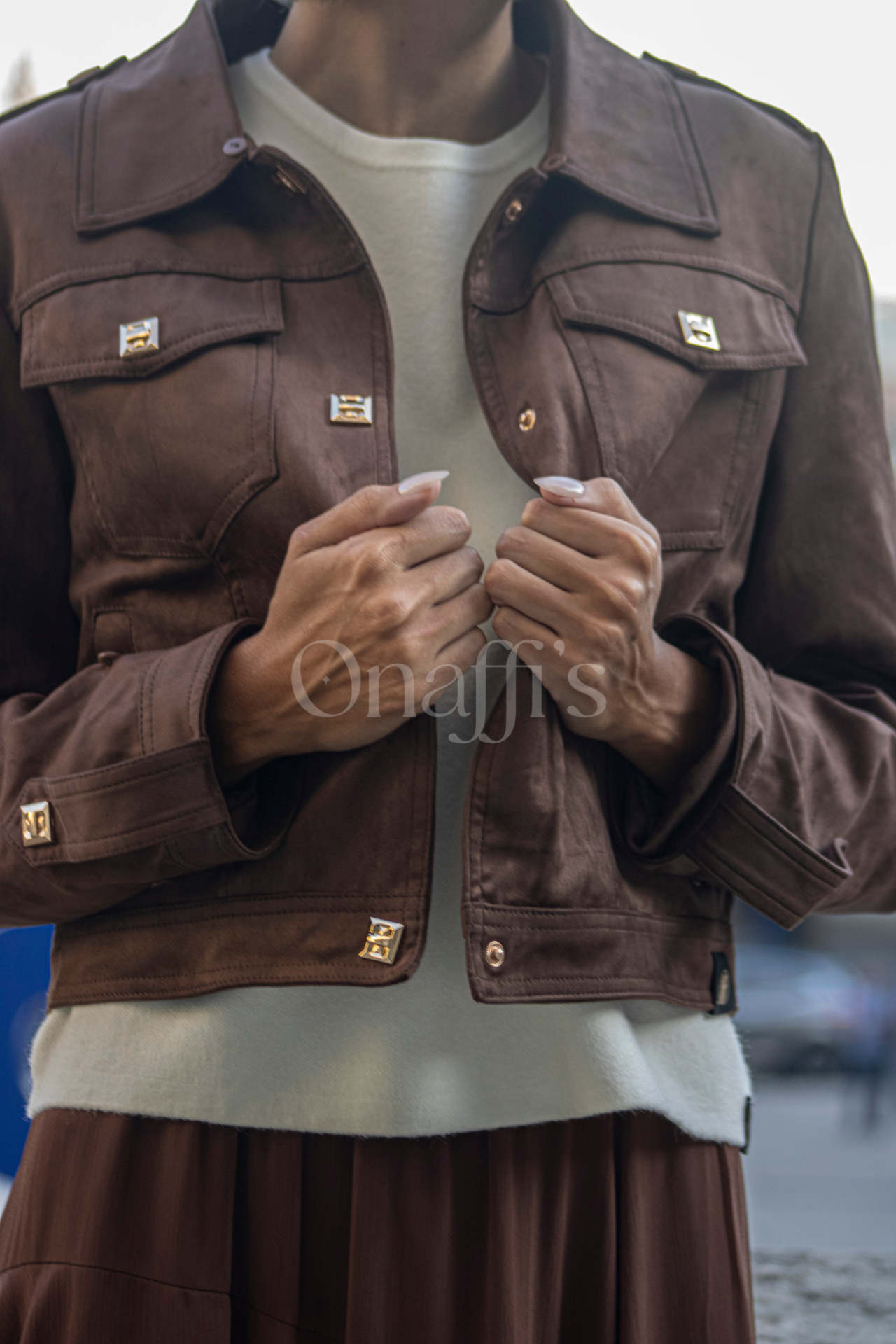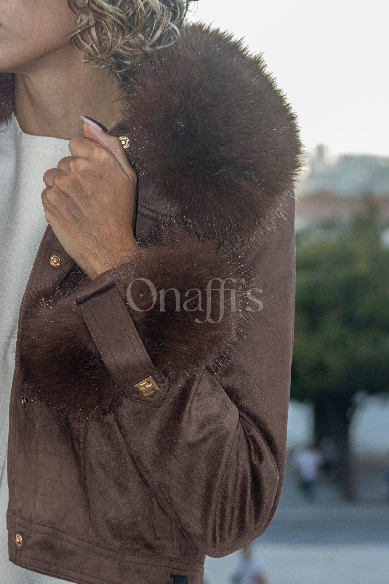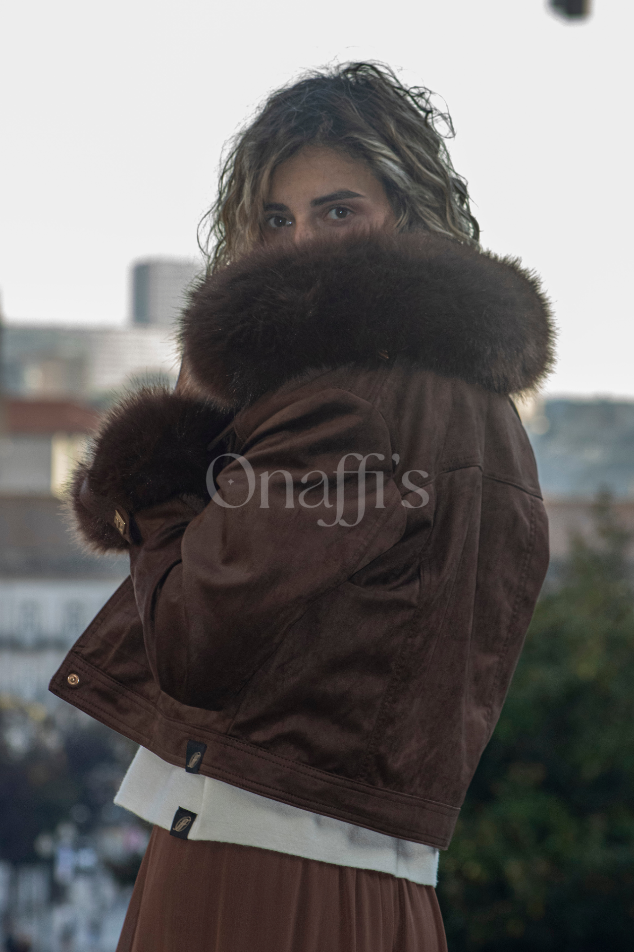 Casaco castanho curto com detalhes de pêlo amovíveis nos punhos e na gola, bolsos no peito e abotoamento central.