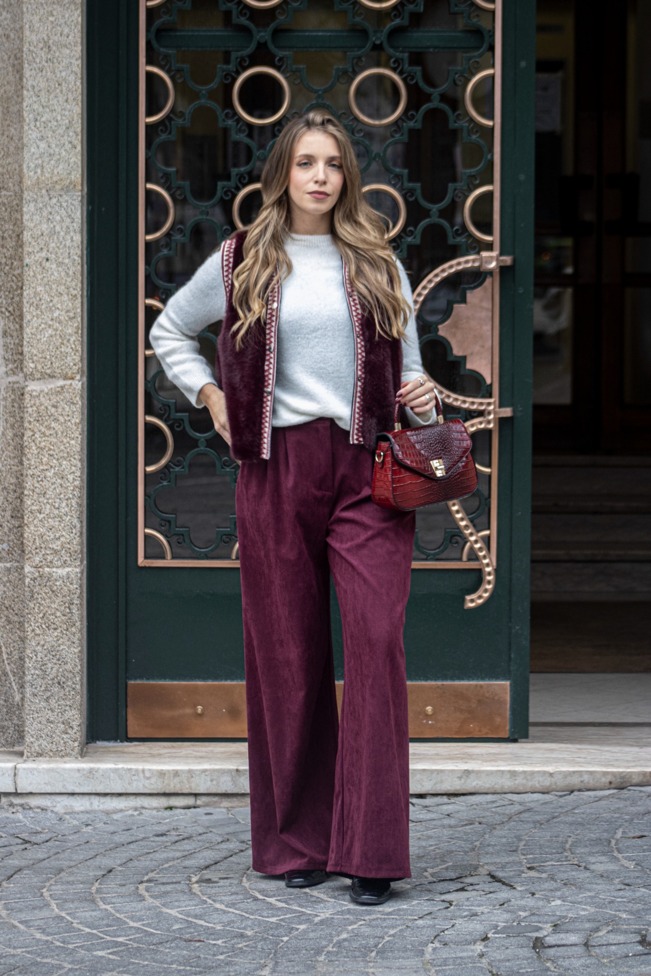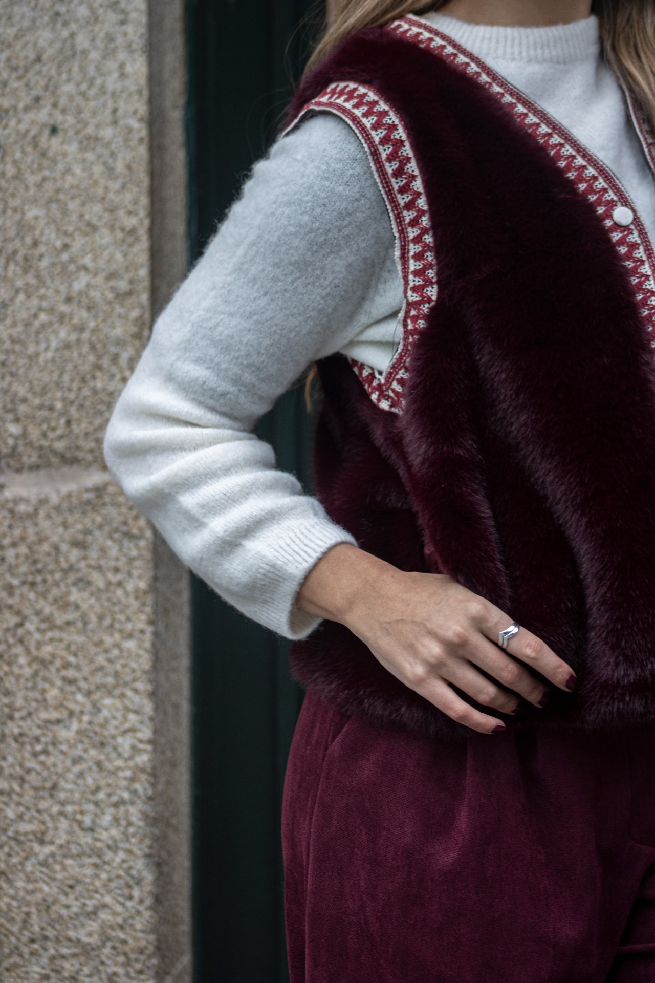 Colete em pêlo sintético com apontamentos trabalhados na cava e na abertura.