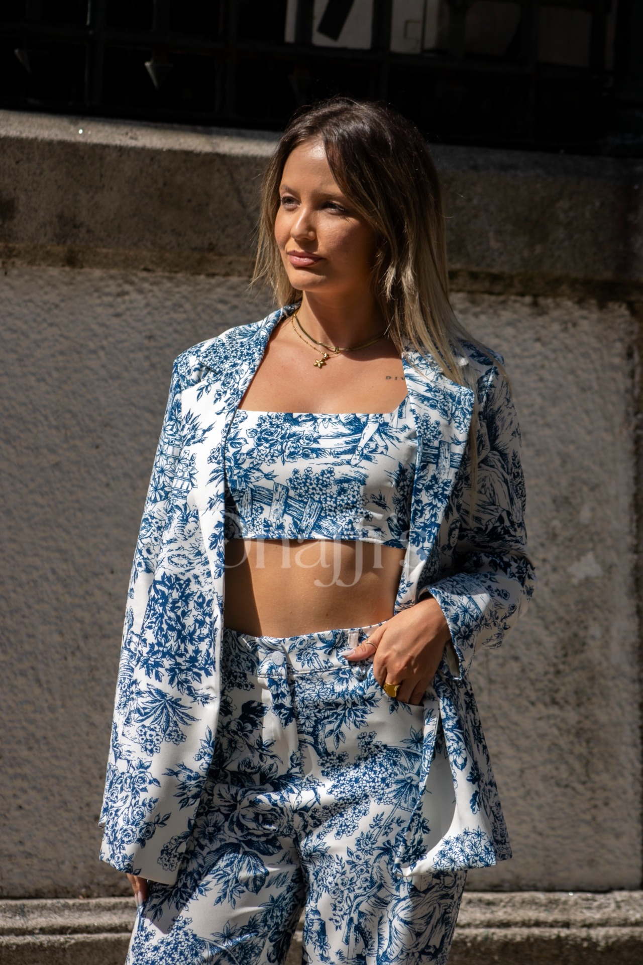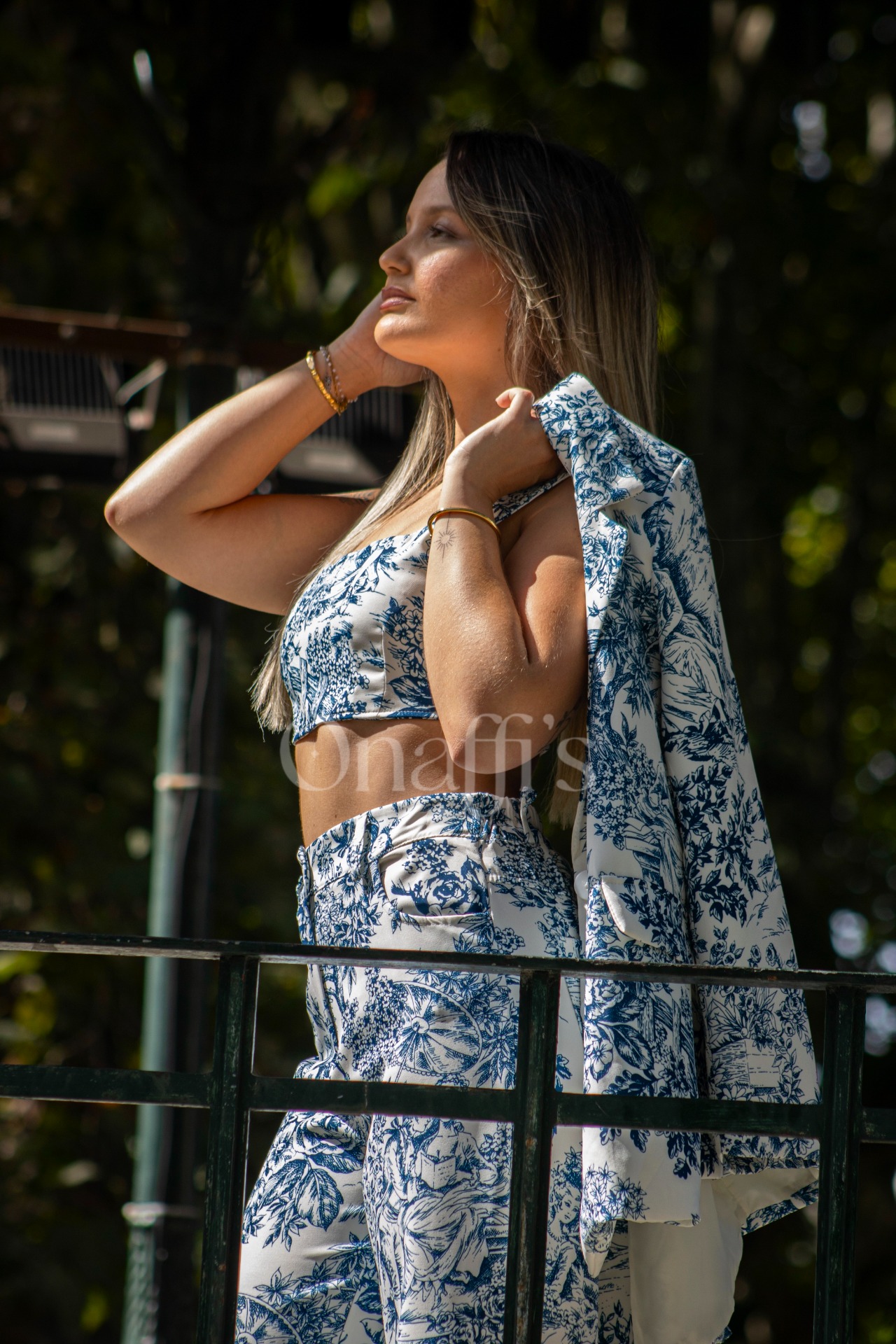 Conjunto composto por blazer, calça e top com tom de fundo branco e estampado azul de motivo floral. Conjunto elegante e moderno com um toque jovial e arrojado.