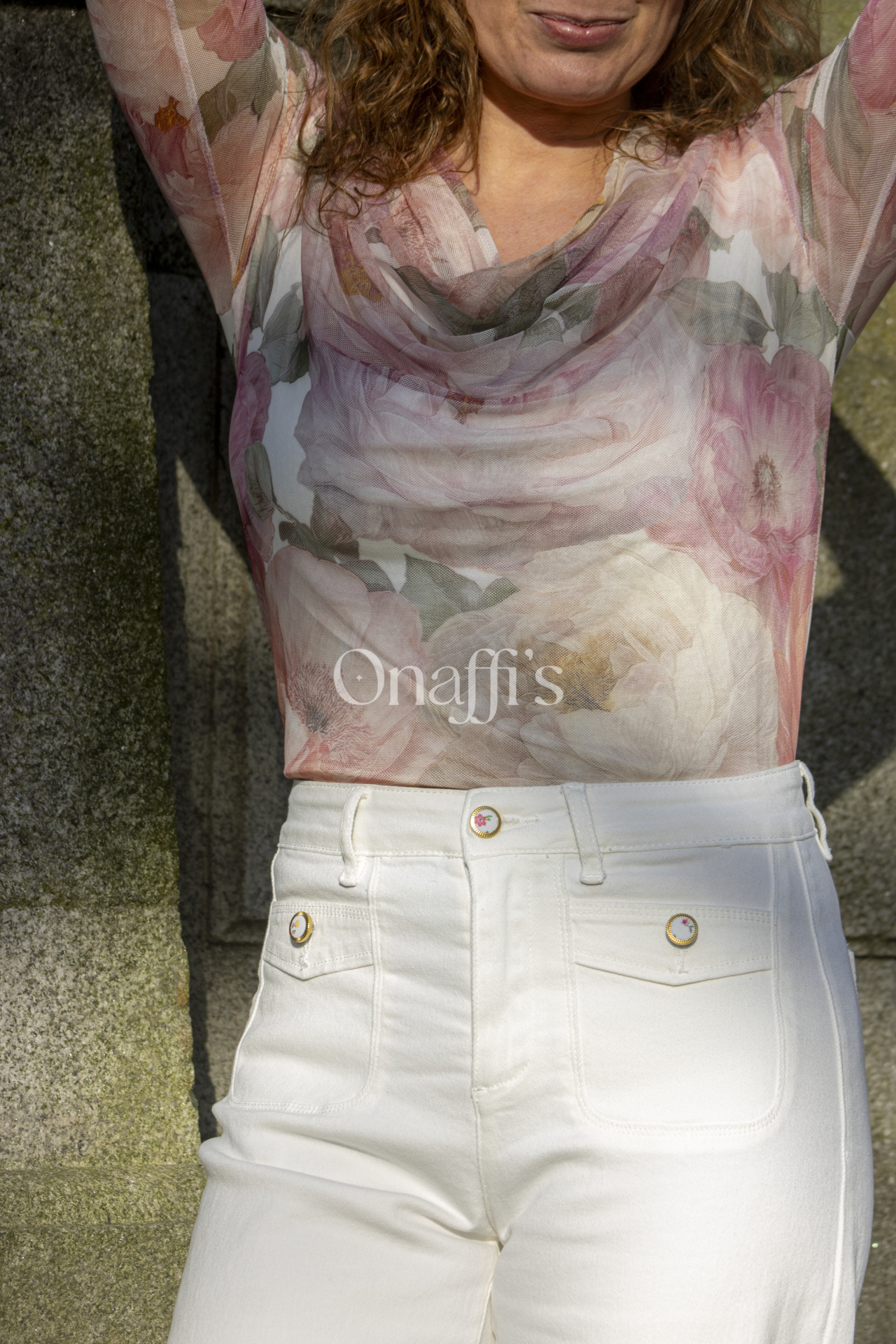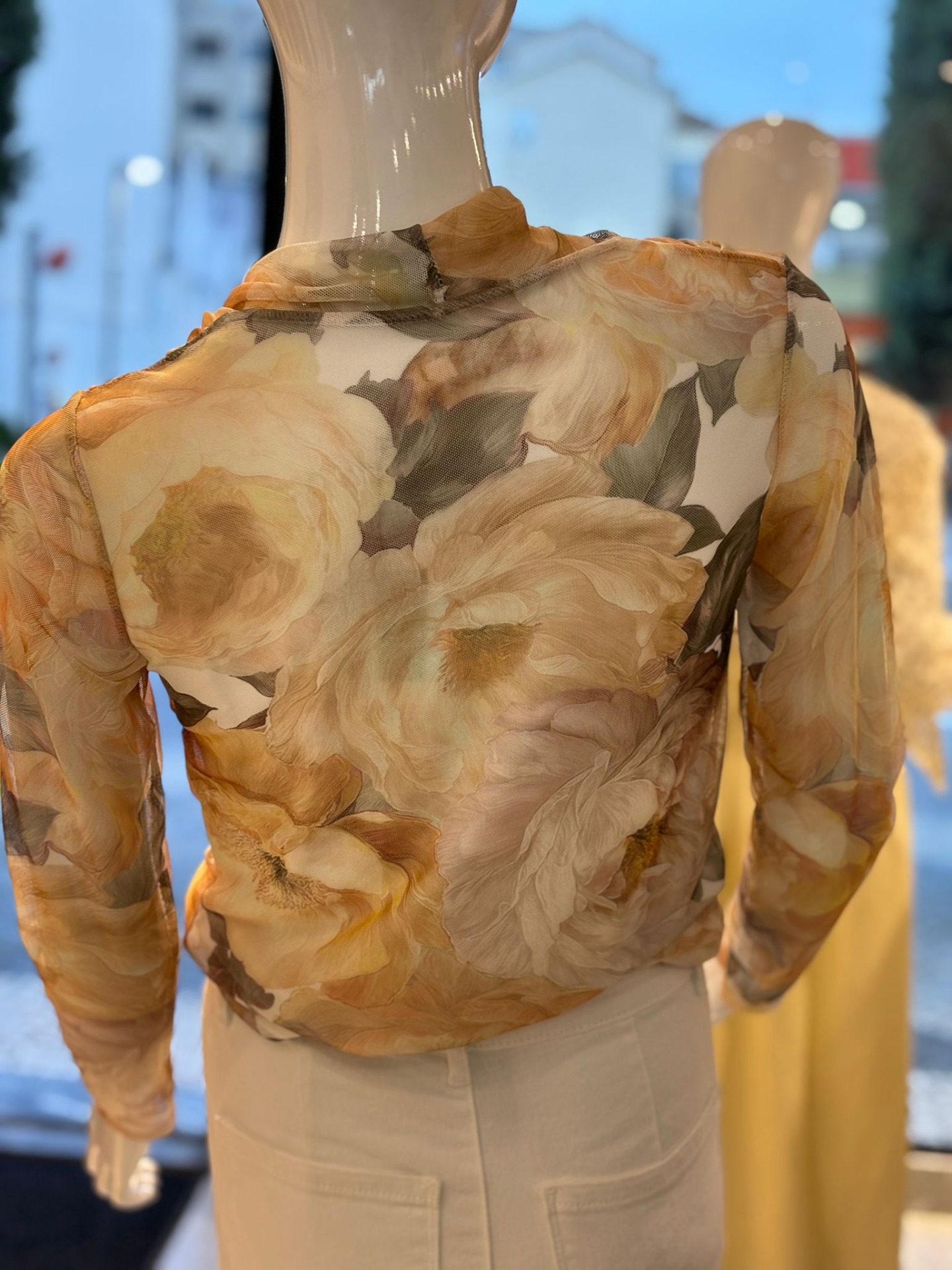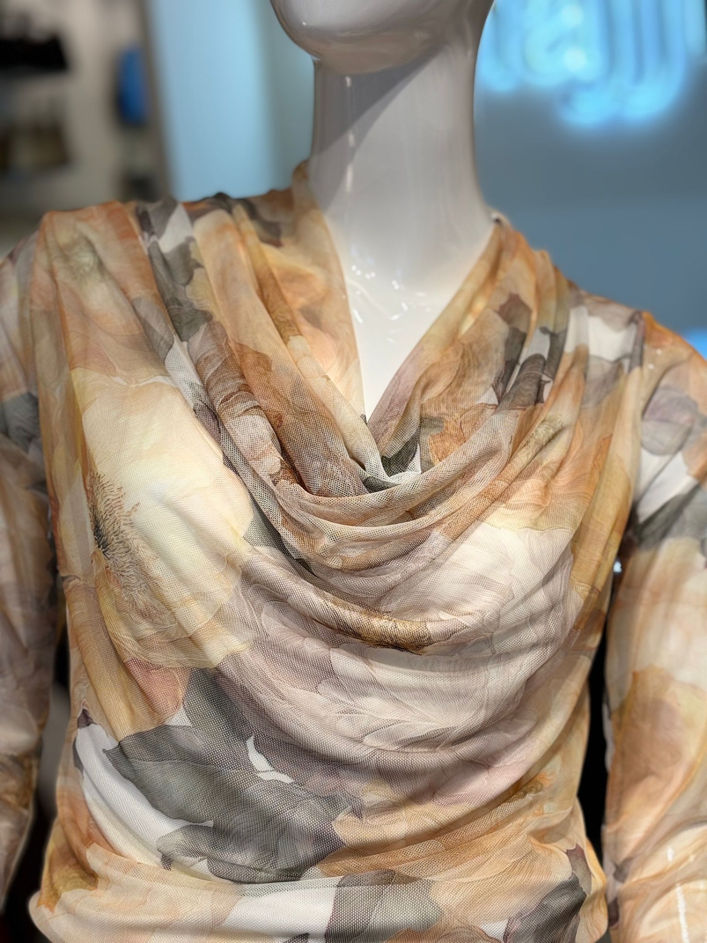 Esta blusa em tule drapeado é a personificação da leveza e do romantismo para esta estação. Desenhada para a mulher que valoriza detalhes únicos, a peça destaca-se pelo seu jogo de transparências e pelo caimento fluído que abraça a silhueta com total elegância.