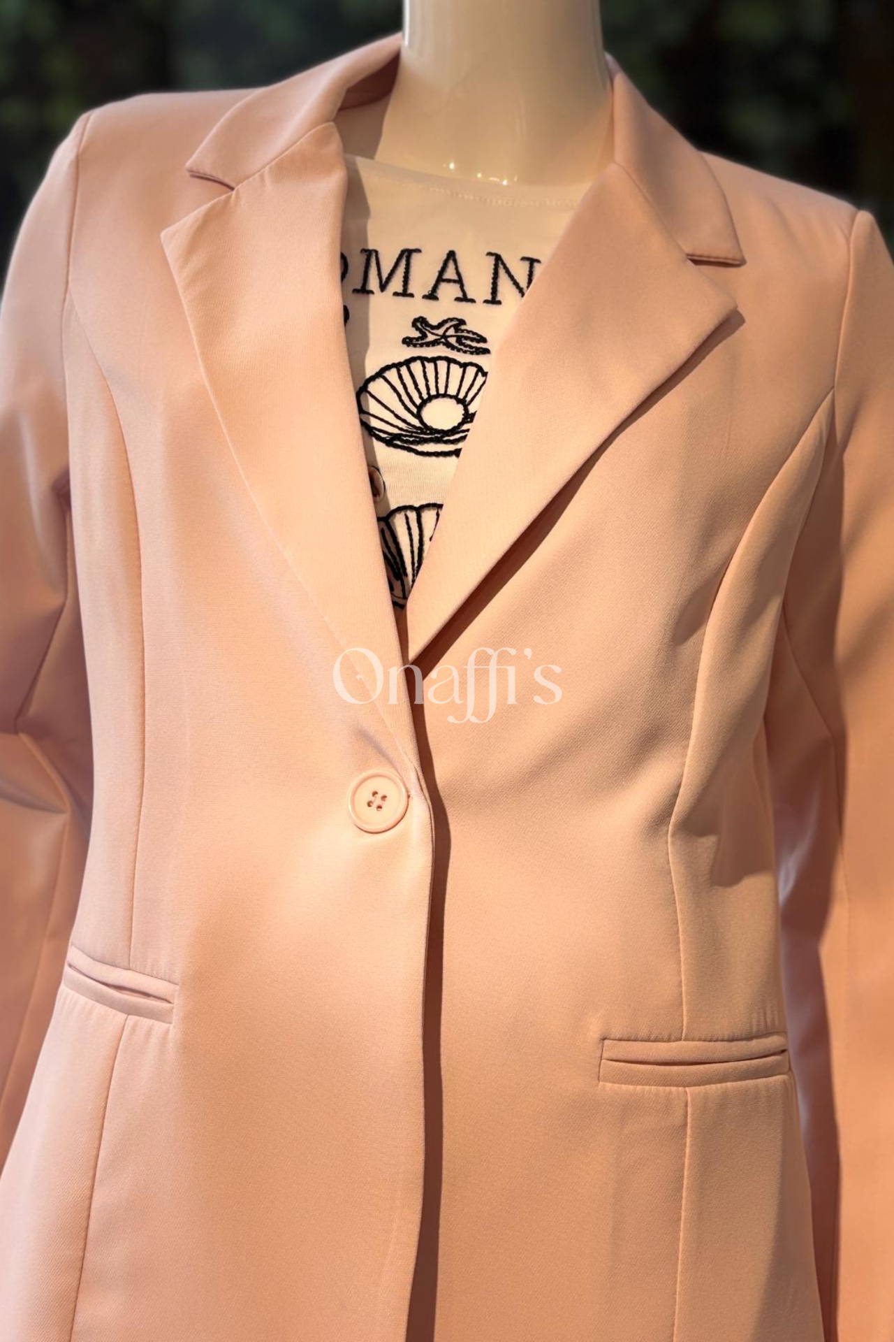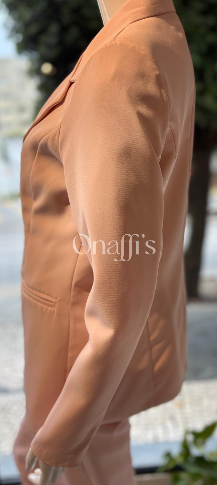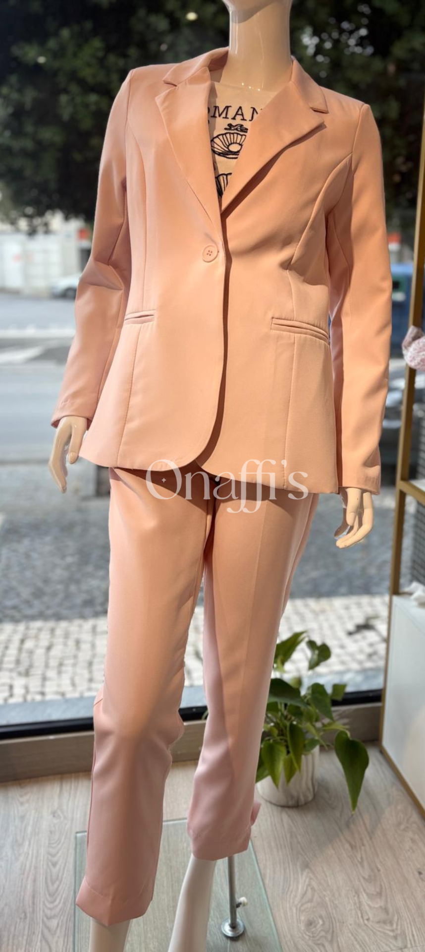O blazer de corte alongado apresenta lapelas clássicas e um abotoamento simples que alonga a silhueta, enquanto as calças de corte slim oferecem um ajuste polido e moderno.