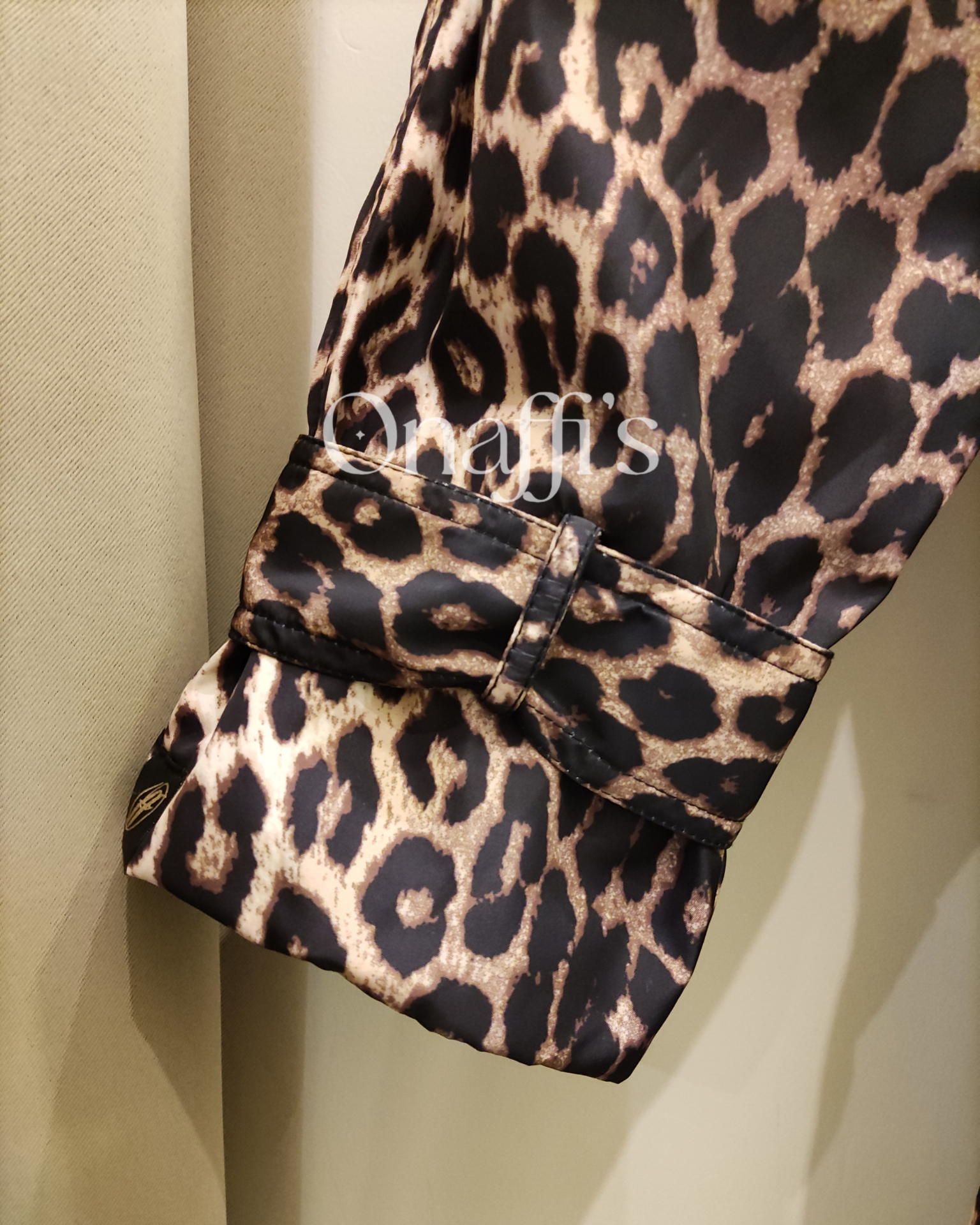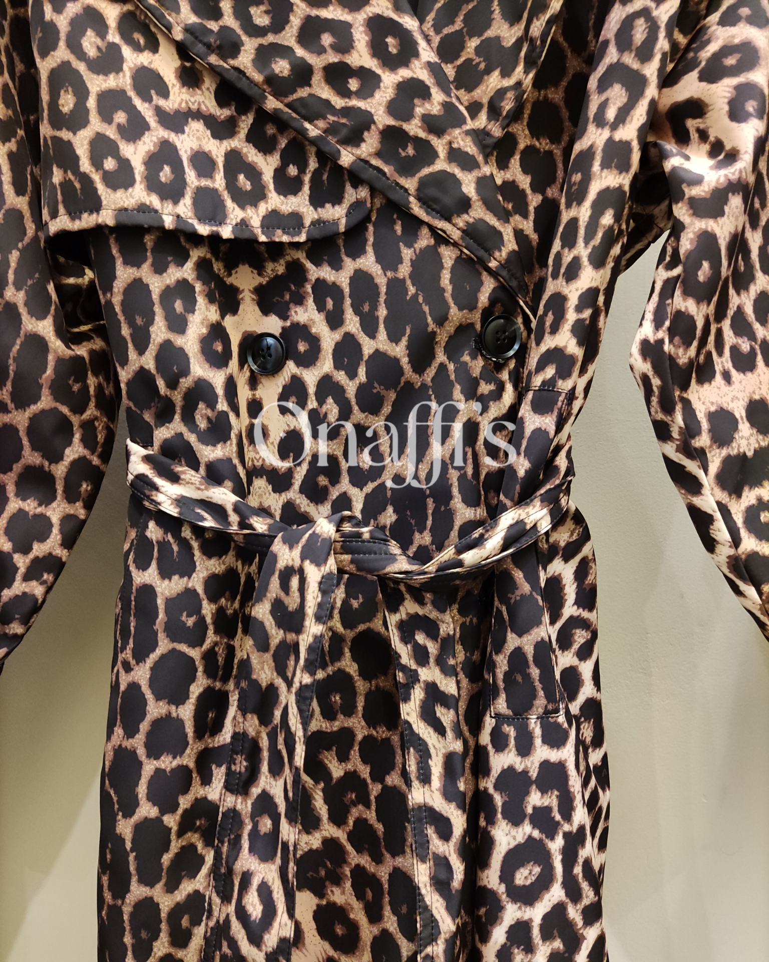 Gabardine com print animal, com cinto na zona da cintura que favorece a silhueta, detalhe de cinto também nos punhos e abotoamento trespassado duplo.