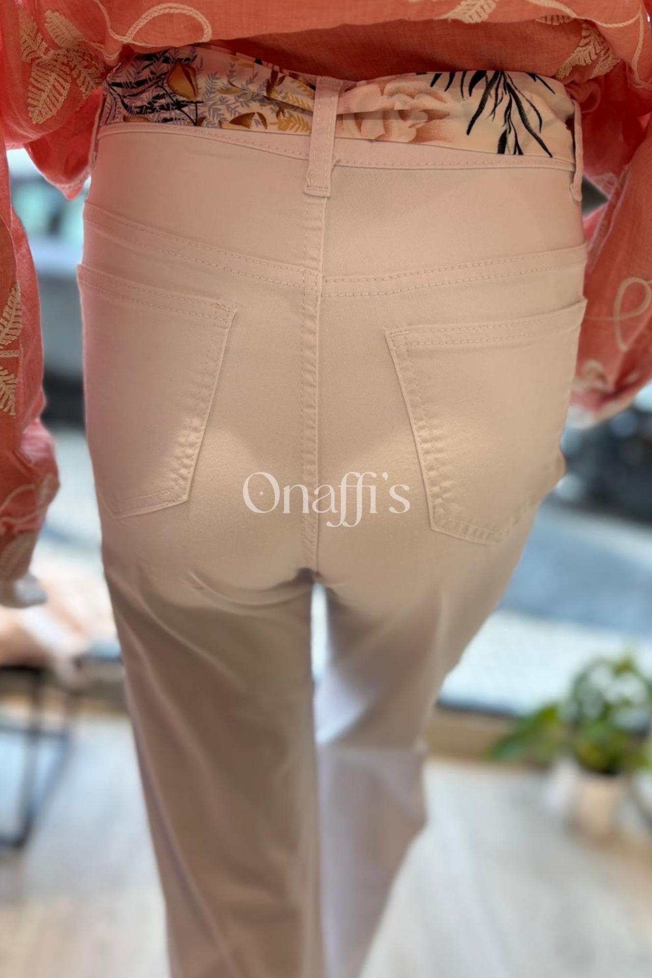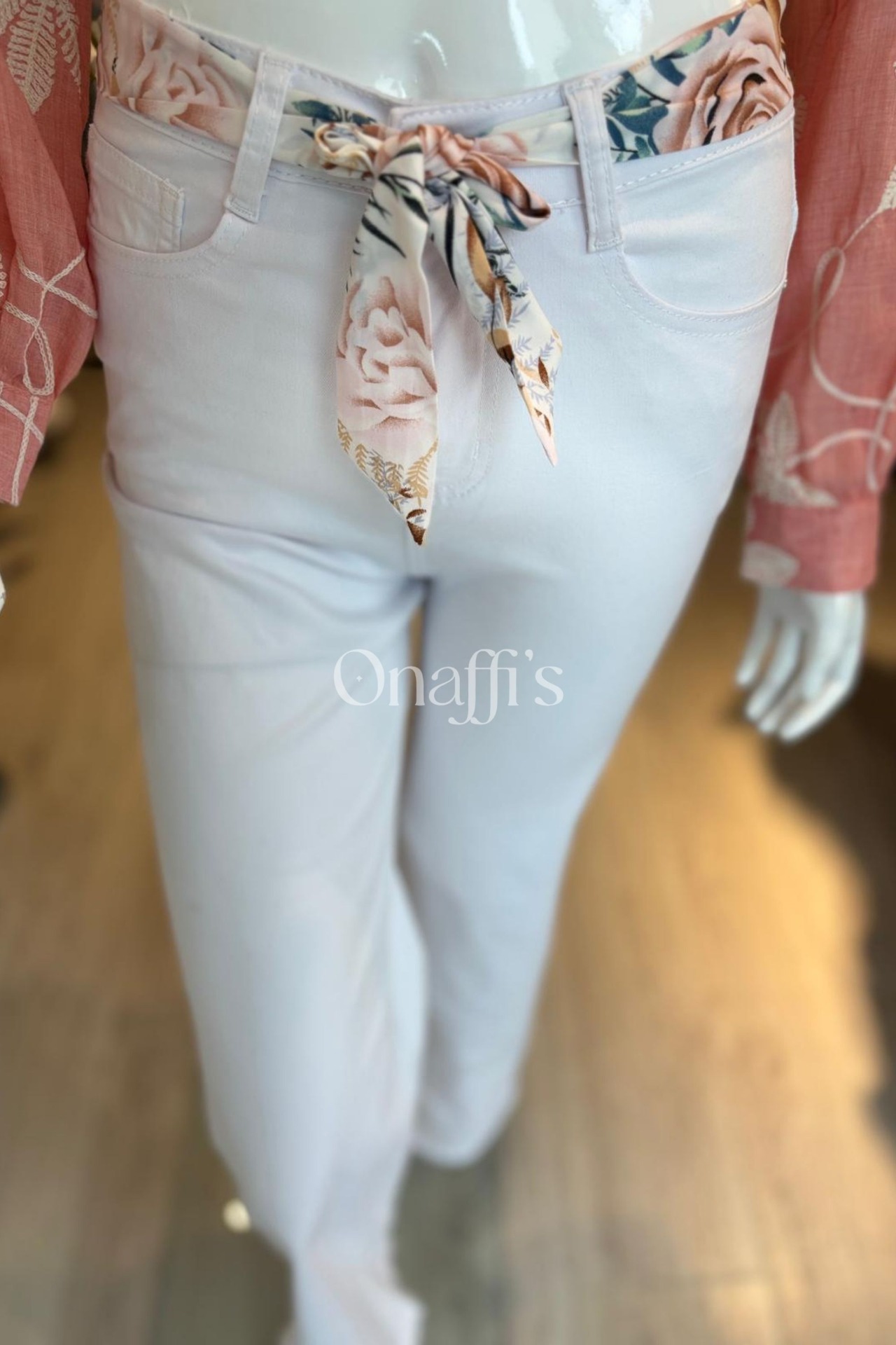 Denim de Algodão Premium: Tecido de ganga branca de alta qualidade, resistente e com um toque suave, que mantém a forma ao longo do dia.