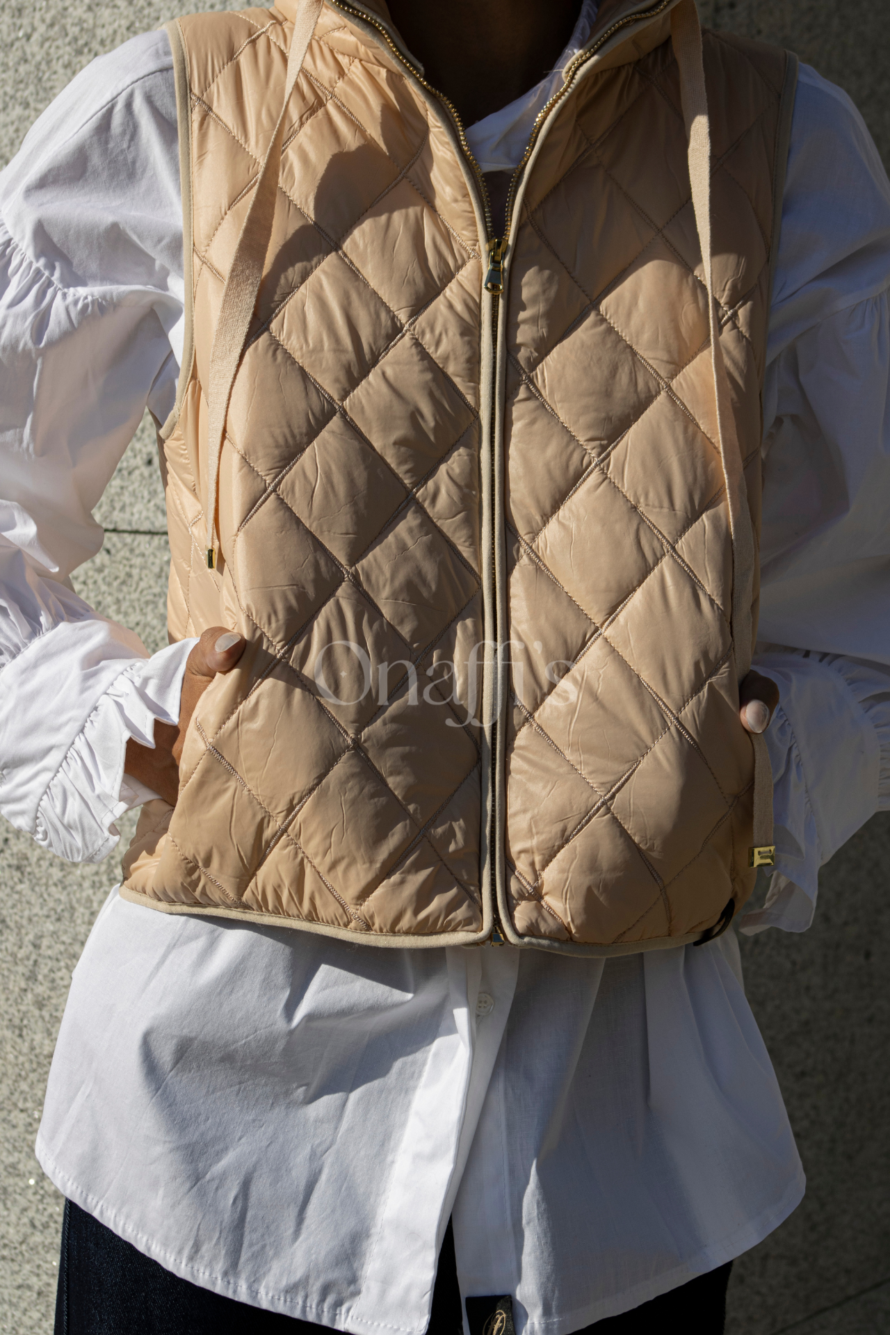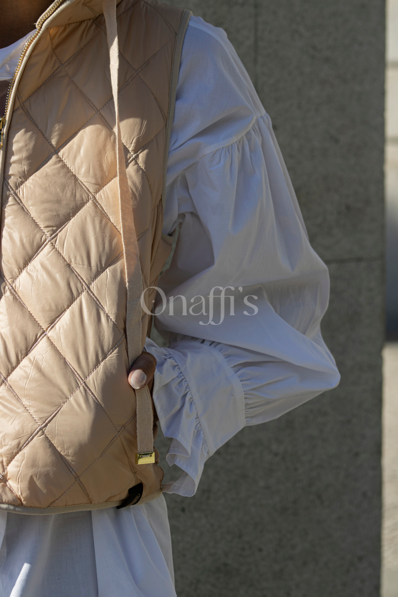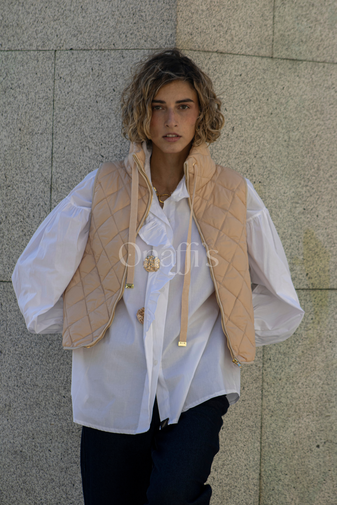 Kispo sem manga, estilo colete, com fecho central e padrão de cozedura em formato de losango.
