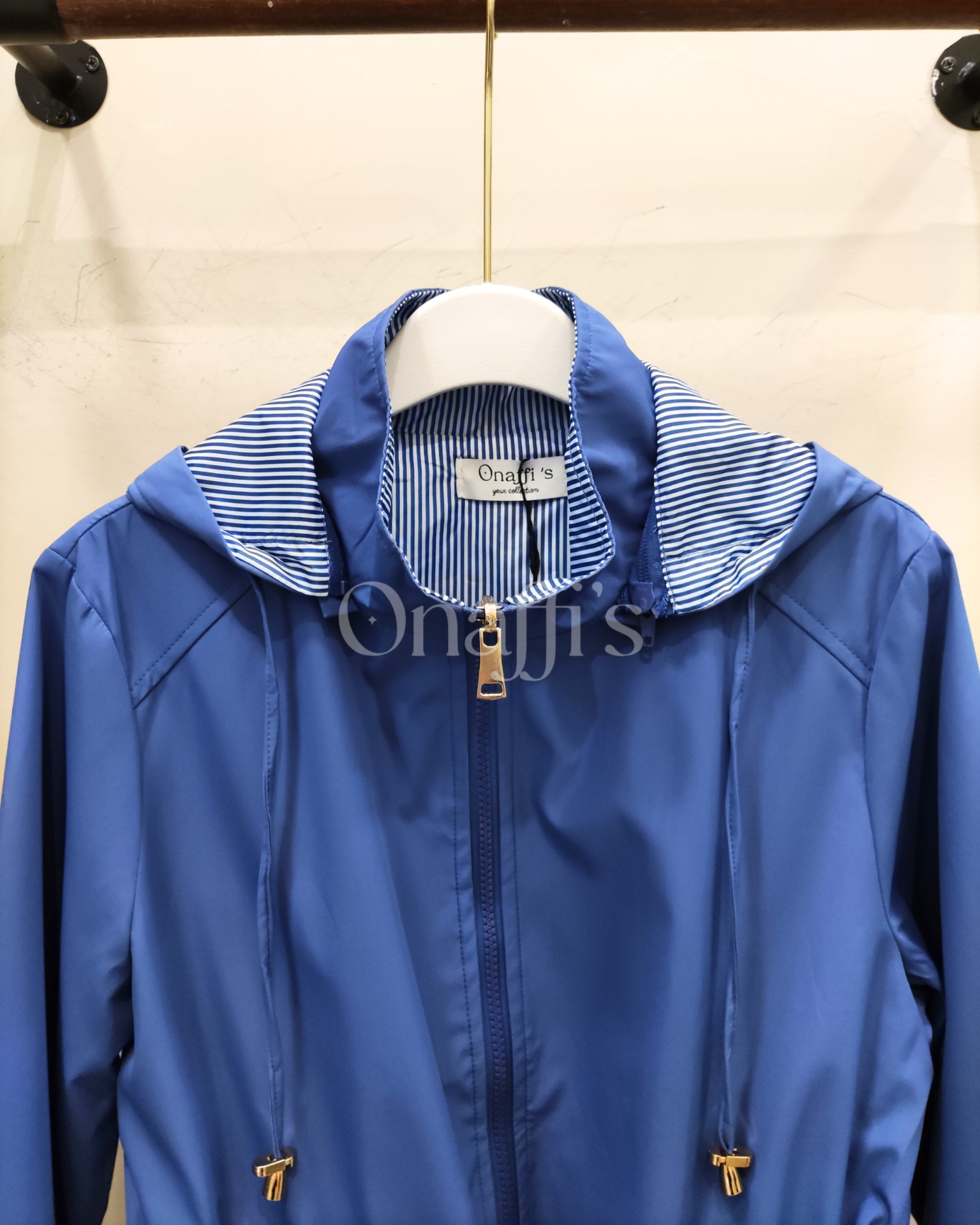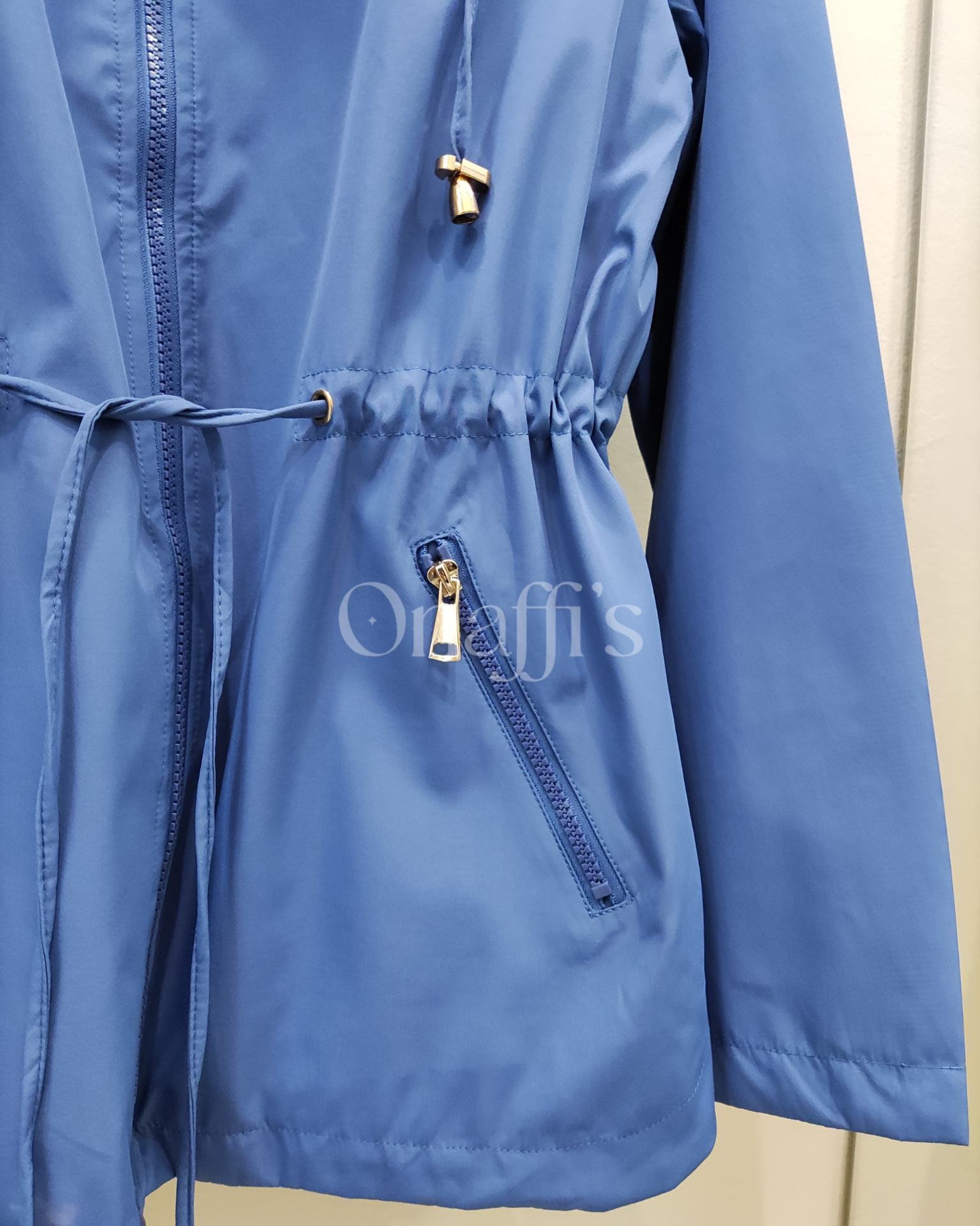 Parka azul com capuz, com fecho zip central, bolsos laterais e possibilidade de ajuste na zona da cinta para um desenho mais acentuado e favorecedor da silhueta.