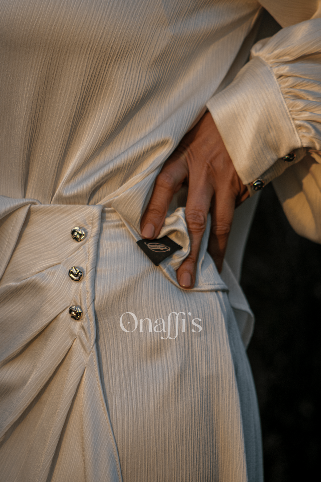 Esta saia é um investimento atemporal. O drapeado e a cor pérola garantem que nunca passe de moda, permitindo inúmeras combinações ao longo das estações.