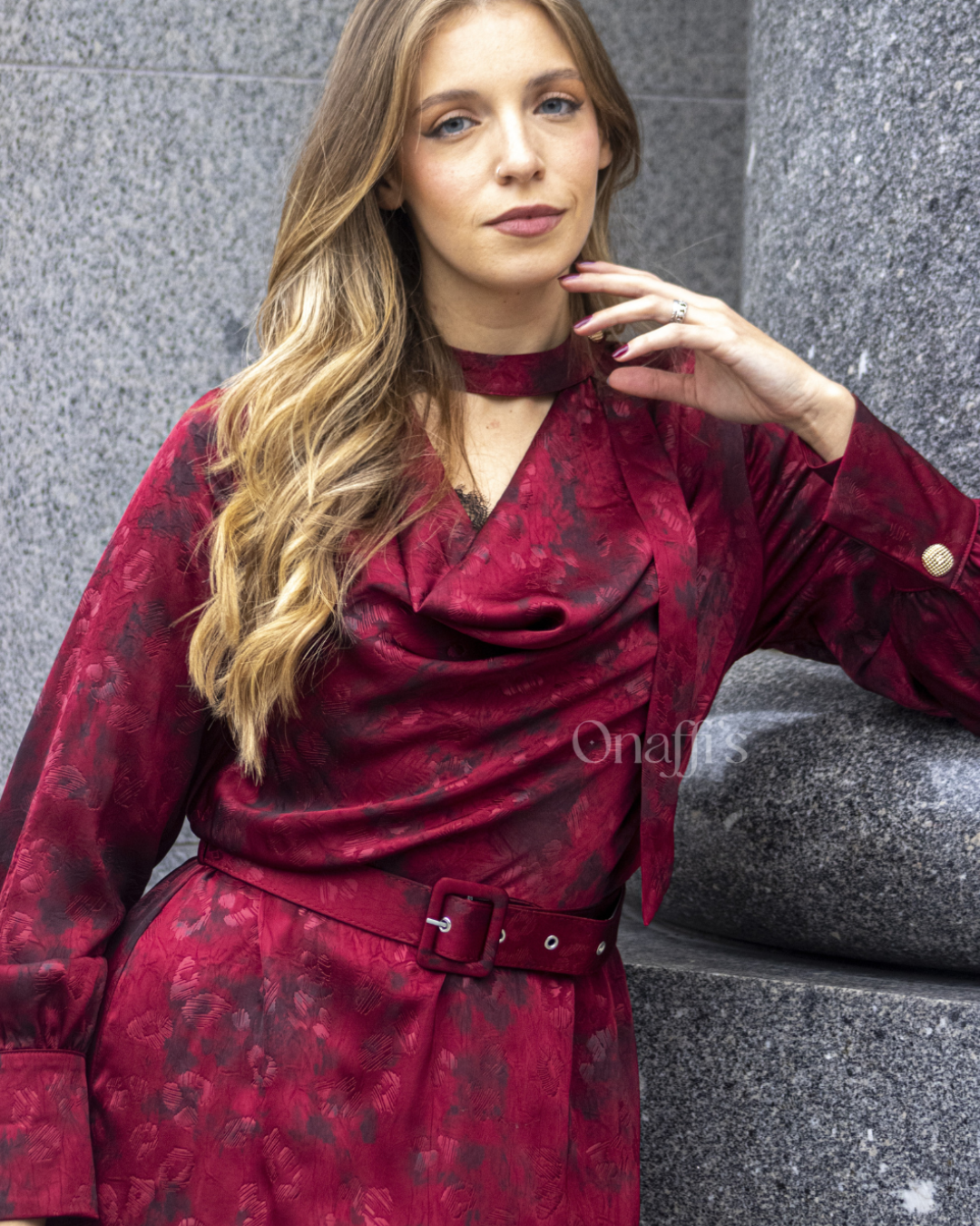Vestido em tecido acetinado, tamanho midi, manga comprida com punhos.