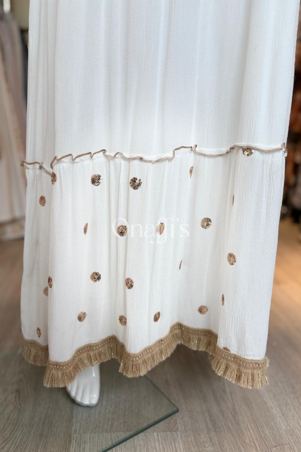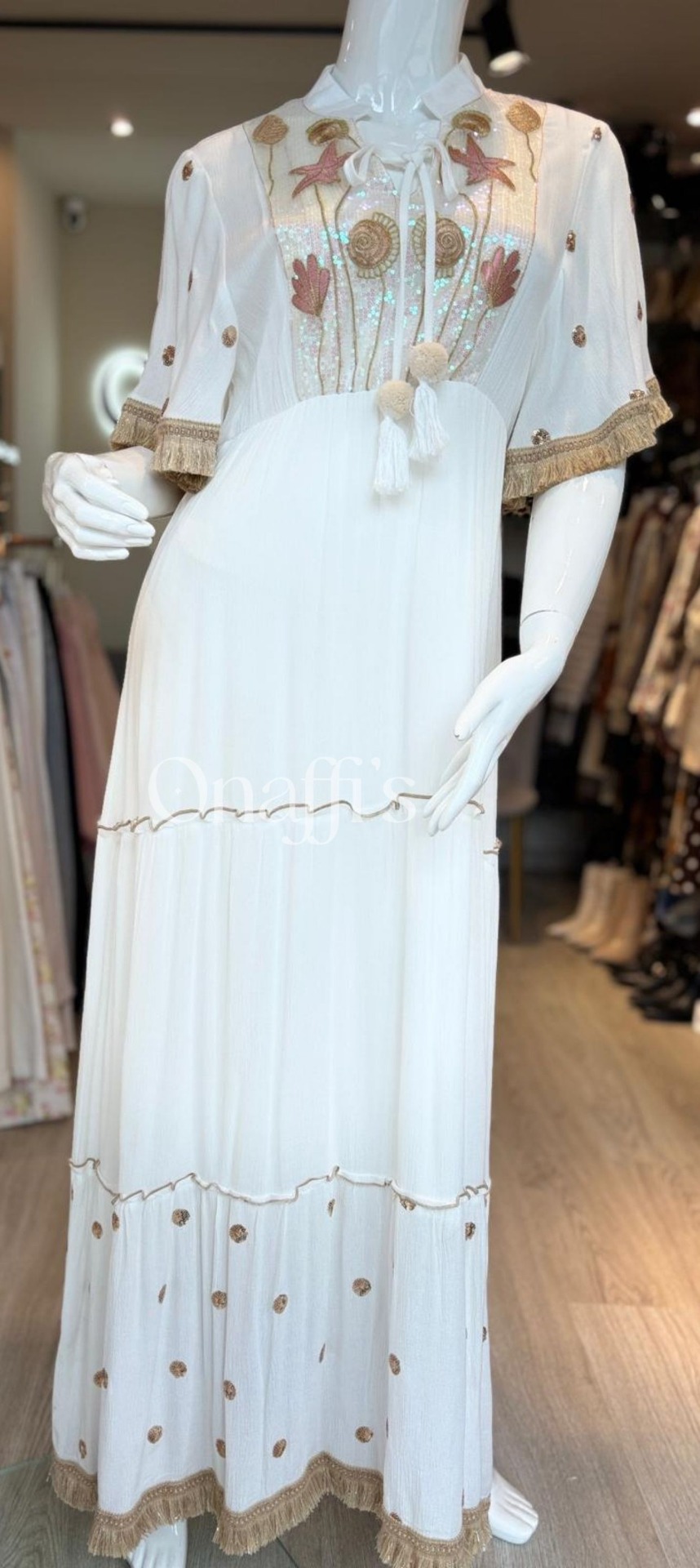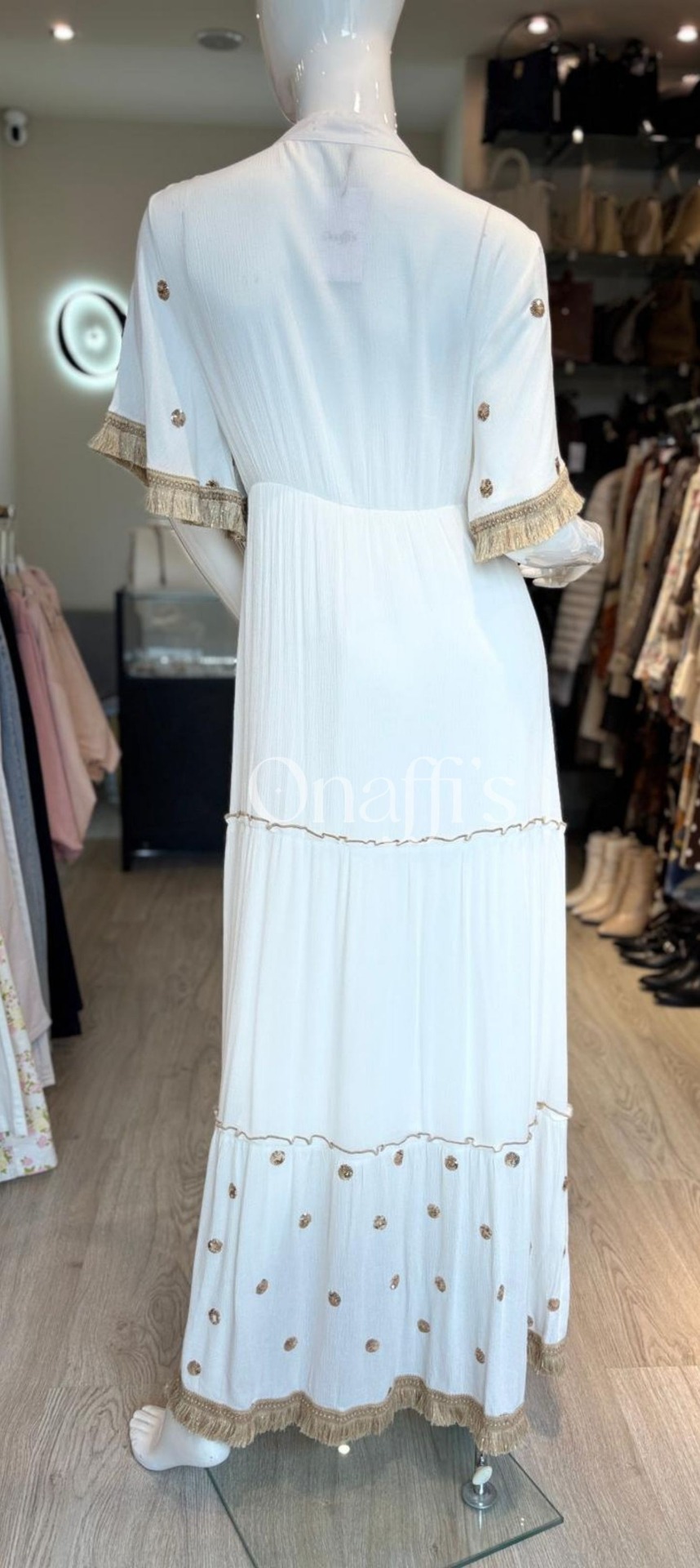Acabamento Artesanal: Mangas curtas e barra do vestido finalizadas com franjas douradas de croché e bordados de pontos dourados, adicionando textura e requinte.