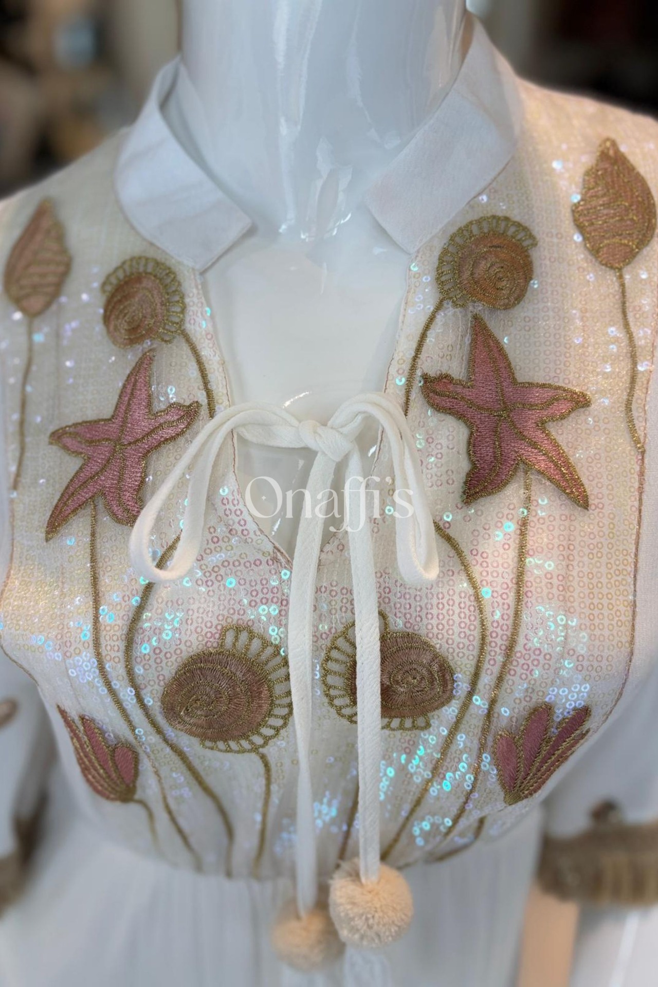 Com uma base branca fluida e texturizada, o vestido destaca-se pelo seu corpete adornado com lantejoulas furta-cor e bordados náuticos em relevo, apresentando motivos de conchas e estrelas-do-mar em tons de rosa suave e dourado, que captam a luz de forma hipnotizante.